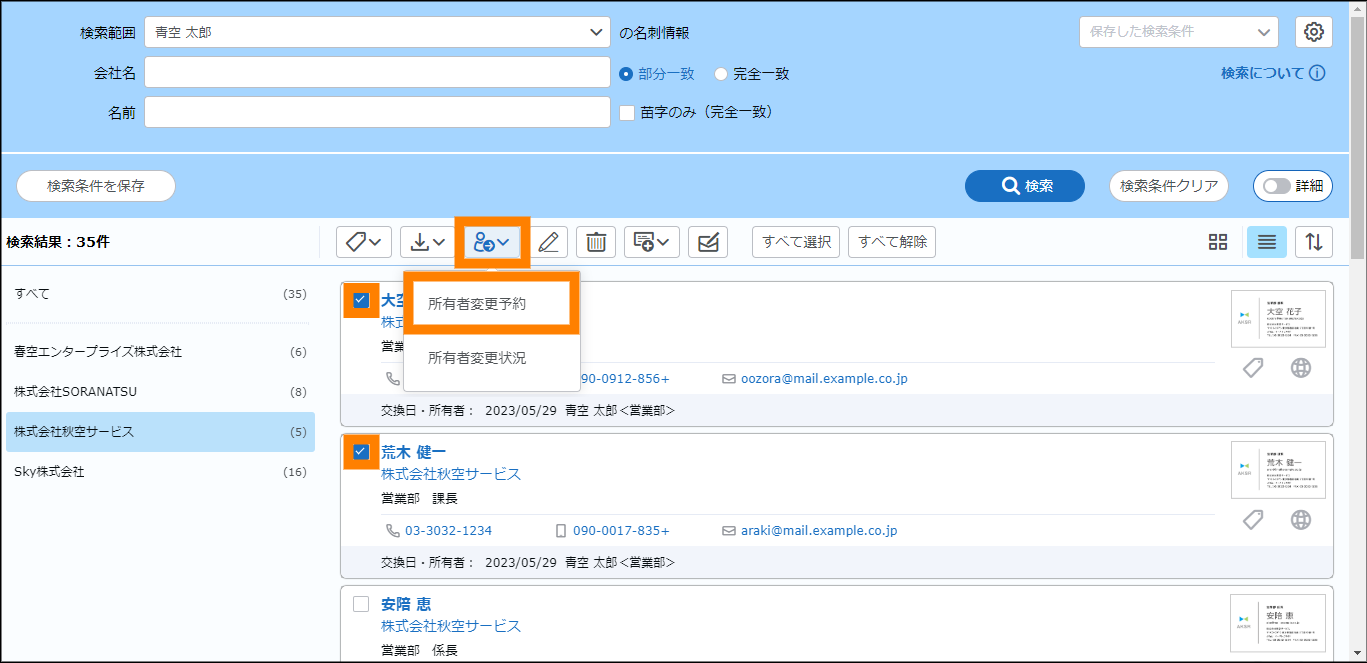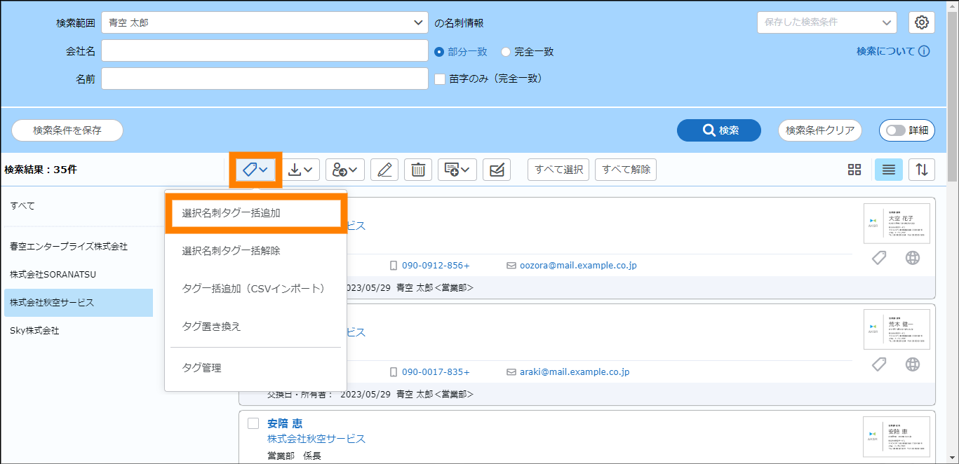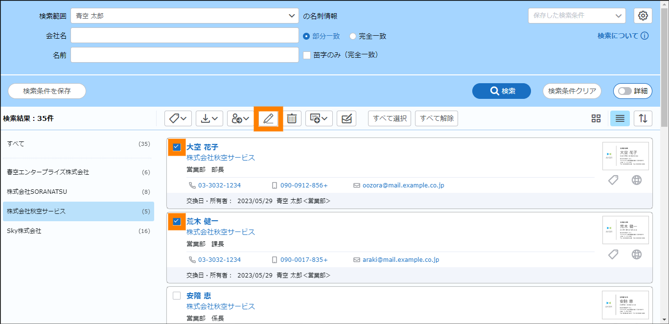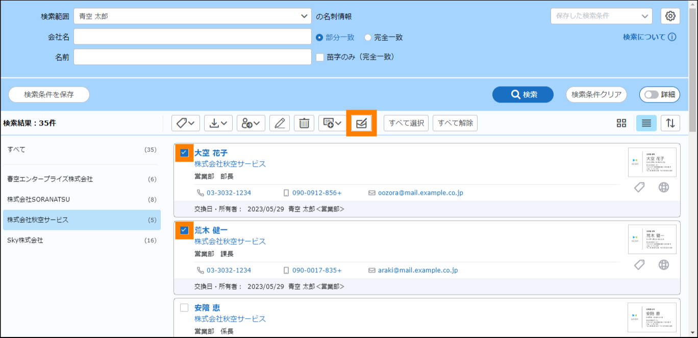 をクリックして「名刺情報一覧」を「リスト表示」で表示した場合、次の操作ができます。