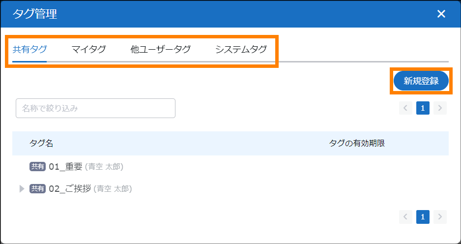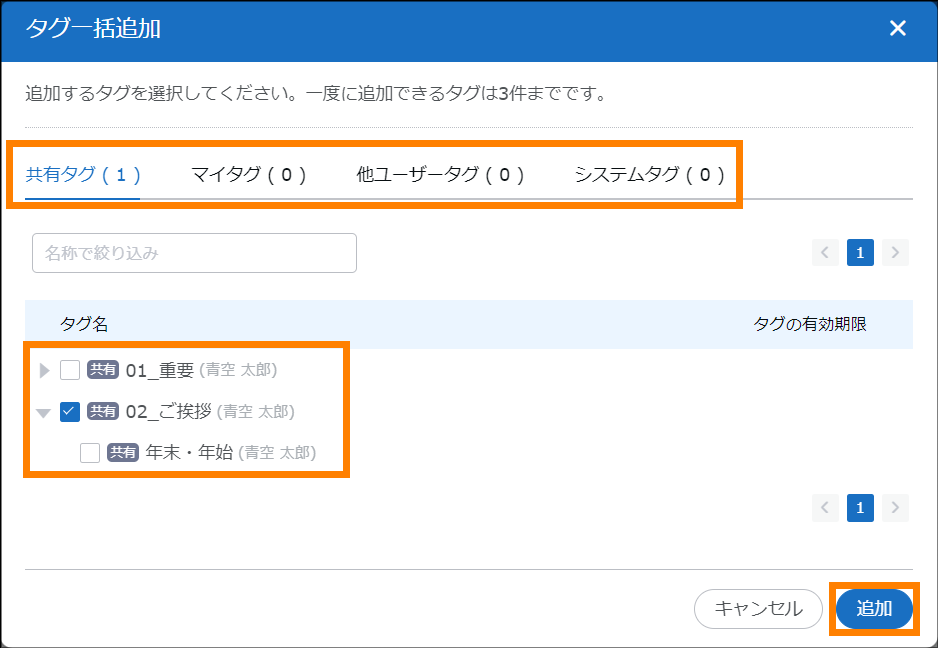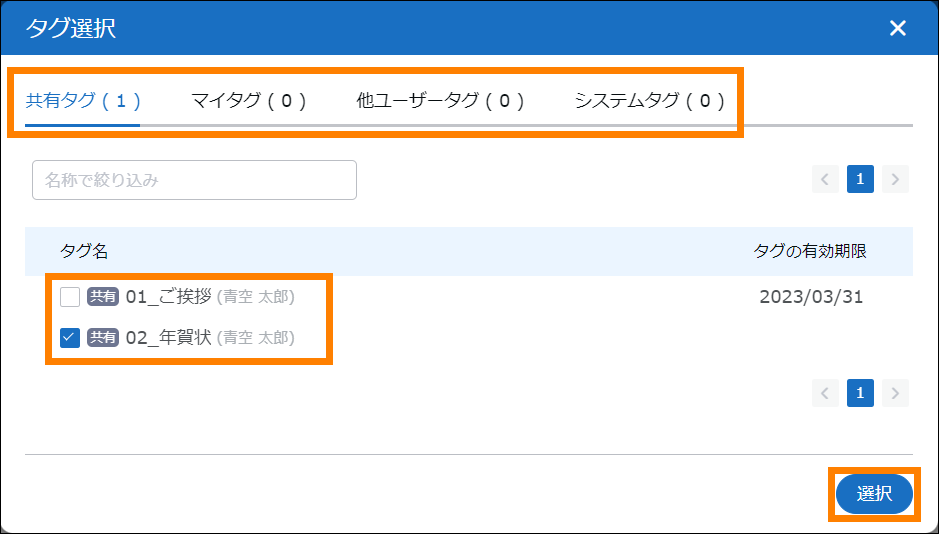 | タグで絞り込み | 一覧に表示される候補がタグで絞り込めます。絞り込む場合は、[タグ追加]をクリックし、対象となるタグを選択してください。 | ||