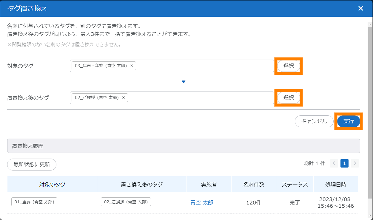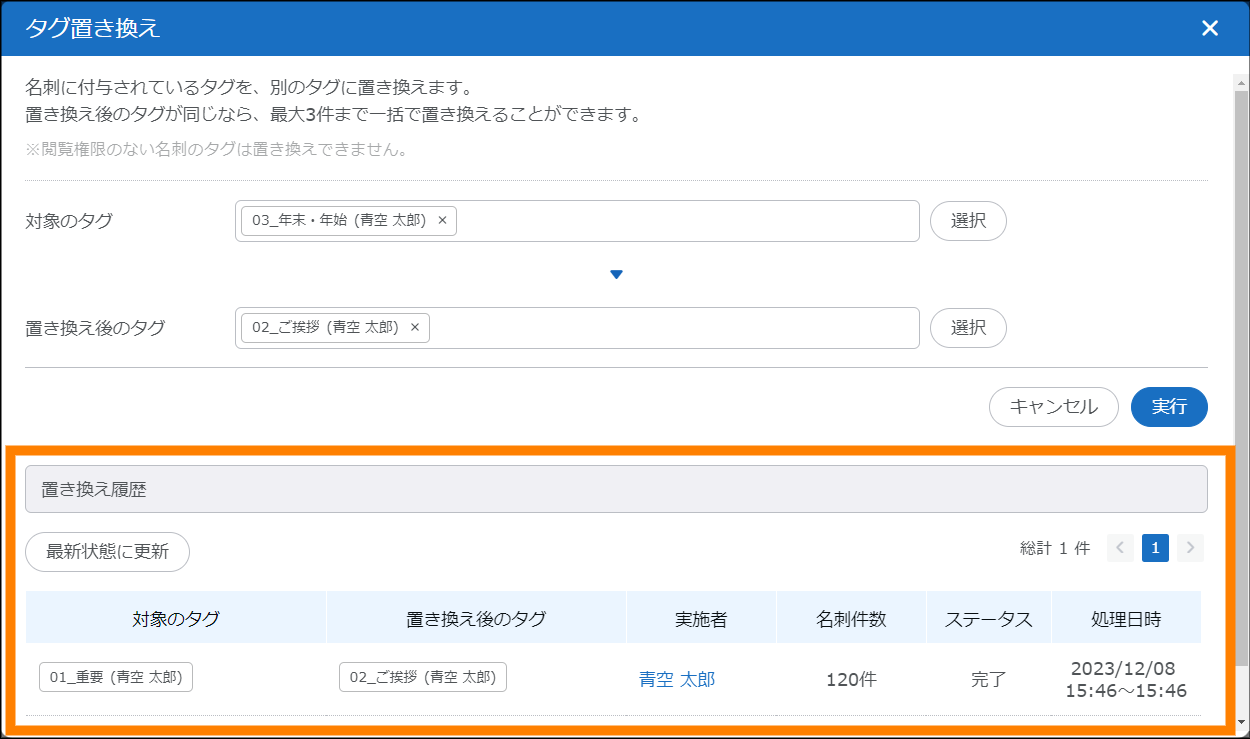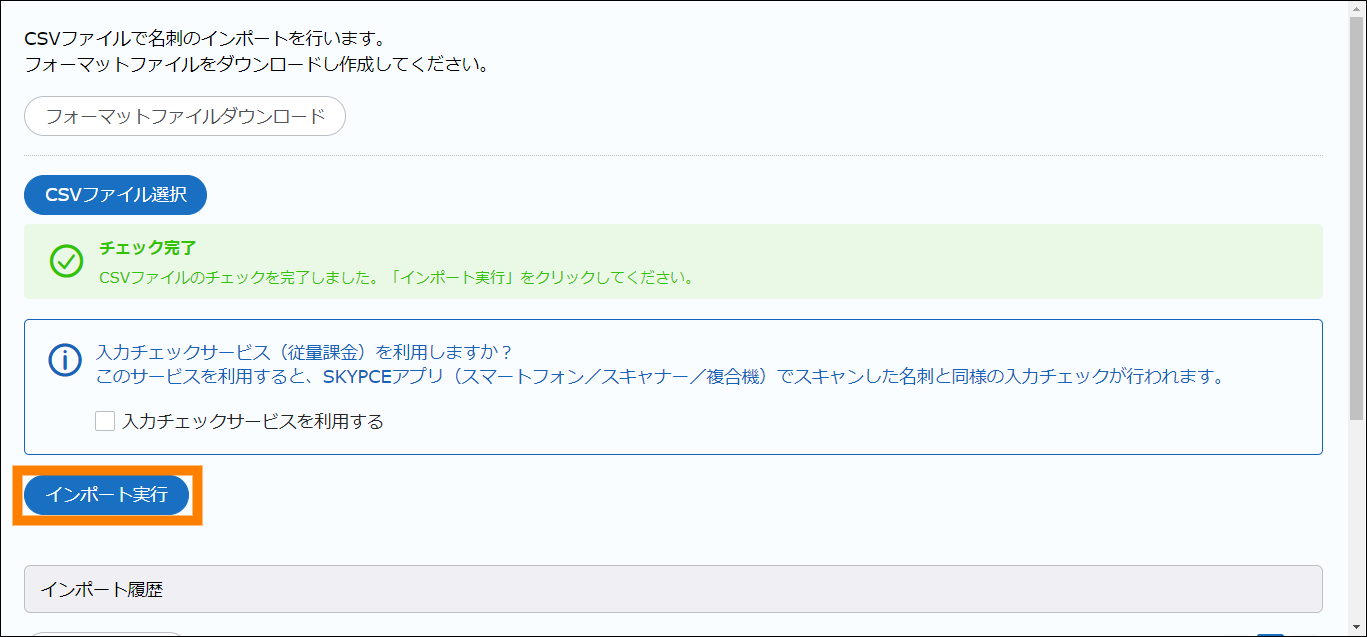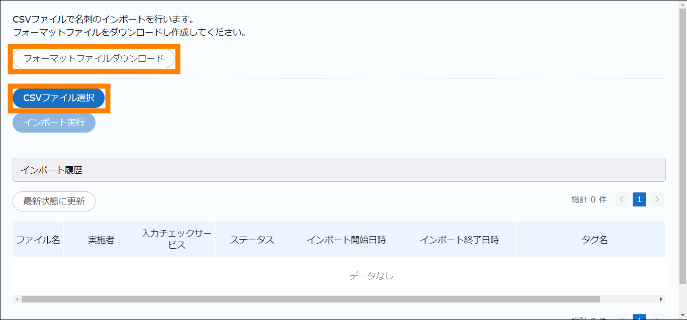 - 名刺情報の一括登録を実行すると、履歴が残ります。実行結果は、「ステータス」に表示されます。また、[最新状態に更新]をクリックすると、履歴が最新の状態に更新されます。