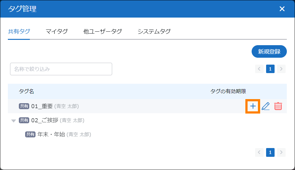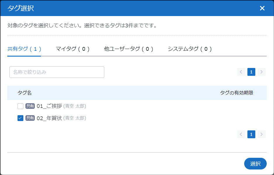 をクリックすると、「タグ選択」画面が表示され、タグの設定ができます。 -
