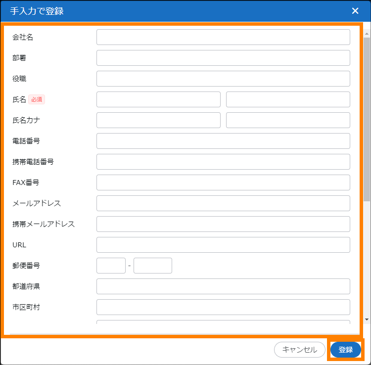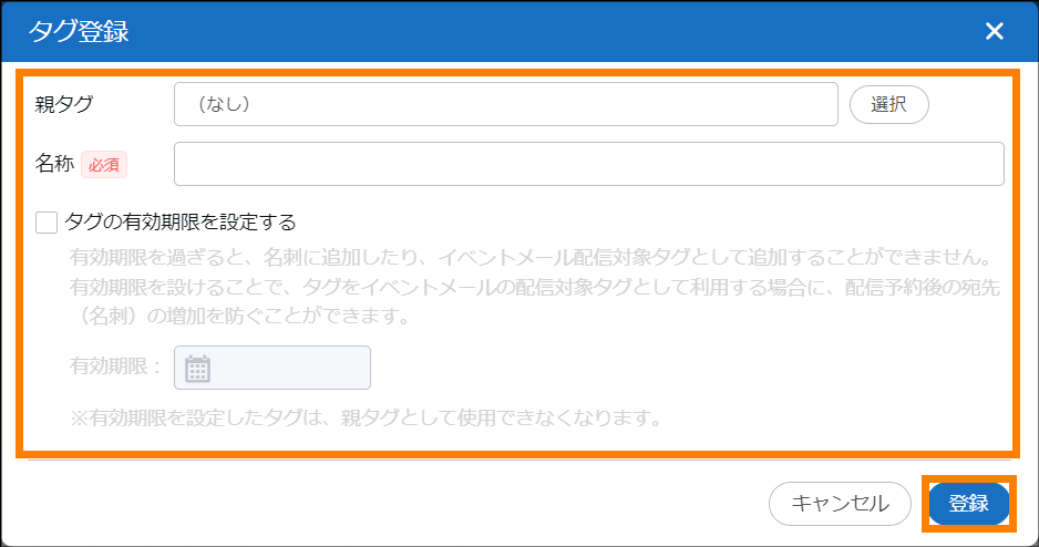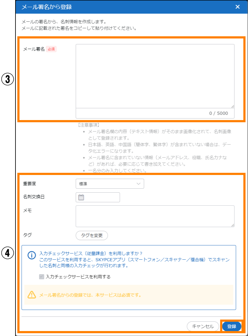 - 登録する名刺情報に共有タグを付与する場合は、あらかじめ付与する共有タグを作成してください。なお、入力したタグが共有タグに存在しないときは、マイタグとしてタグが付与されます。