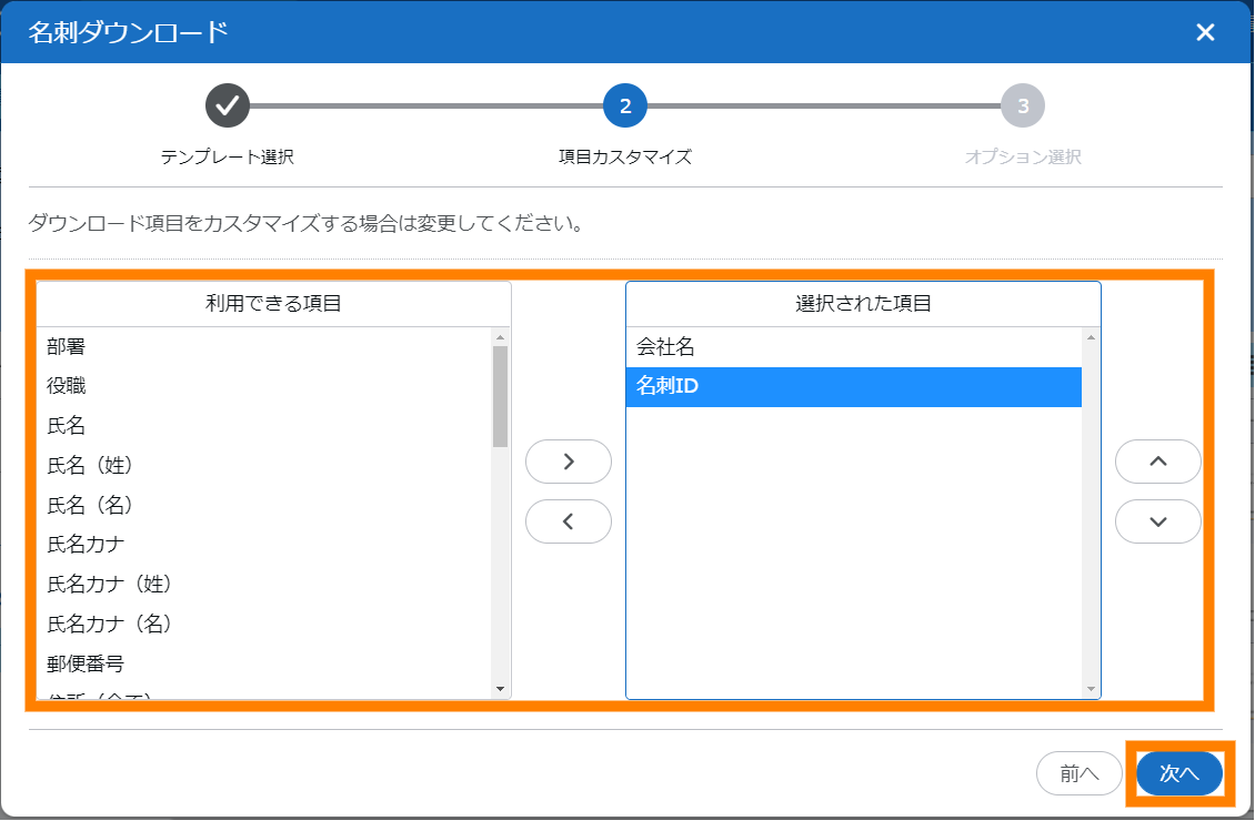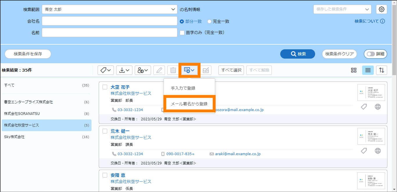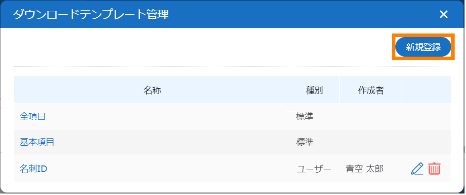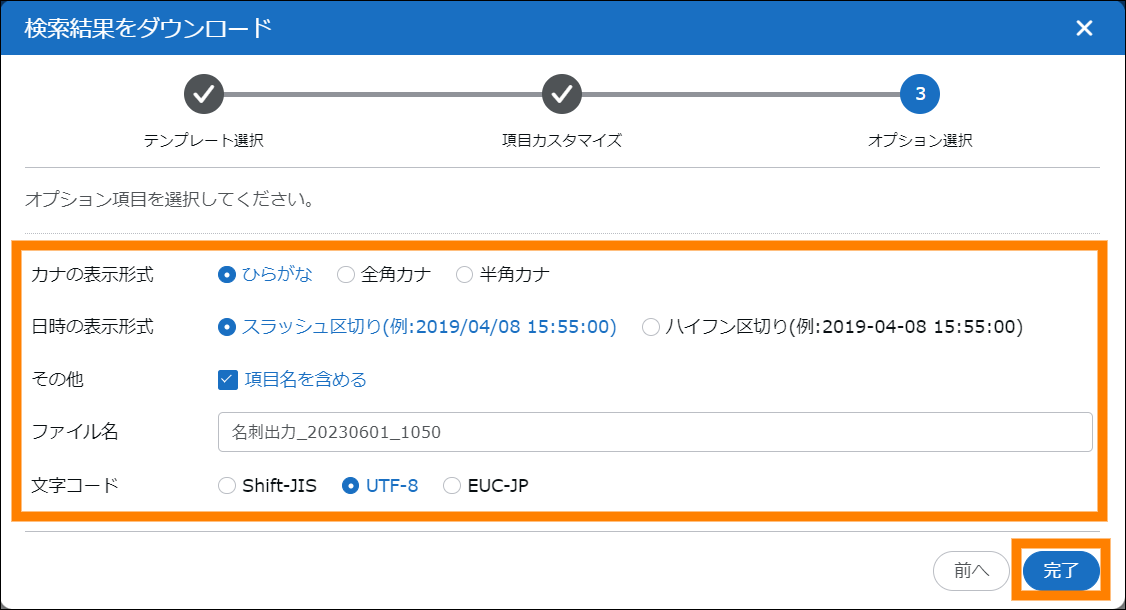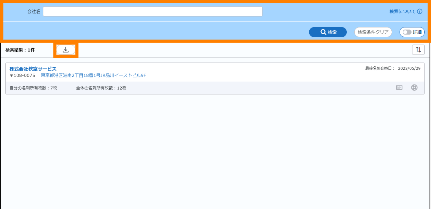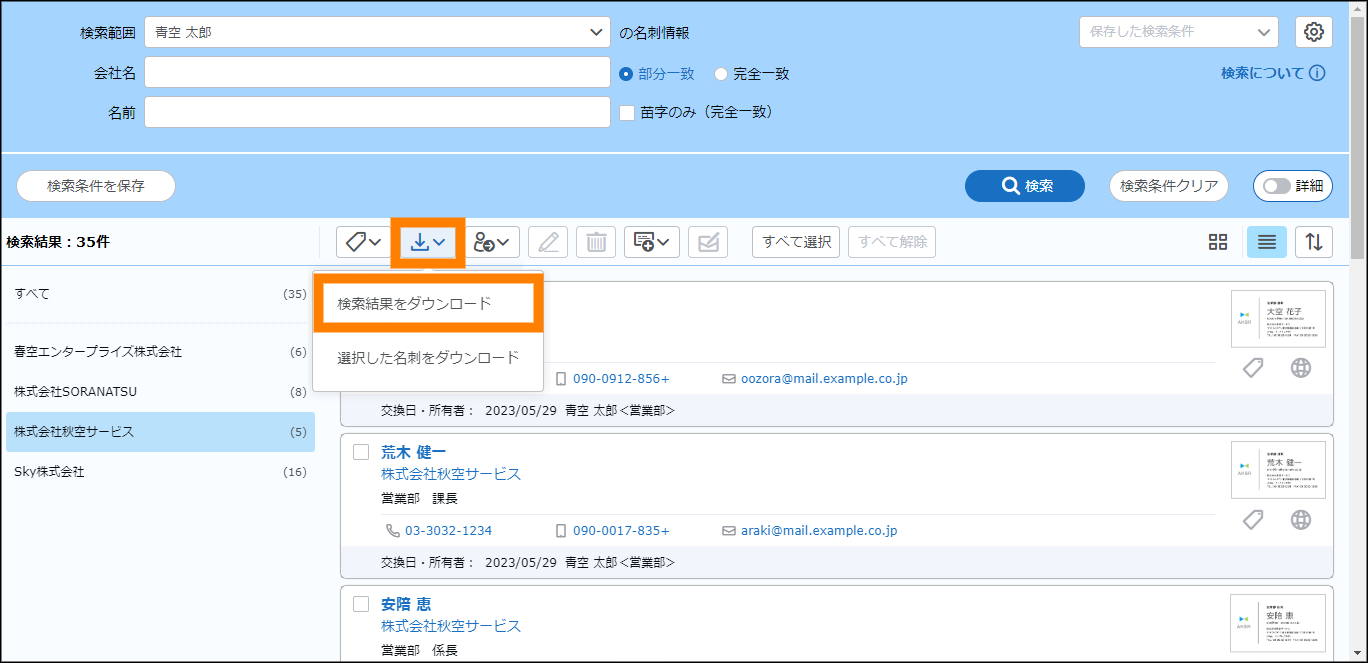 名刺の検索結果のダウンロードができます。 | 参照 | |