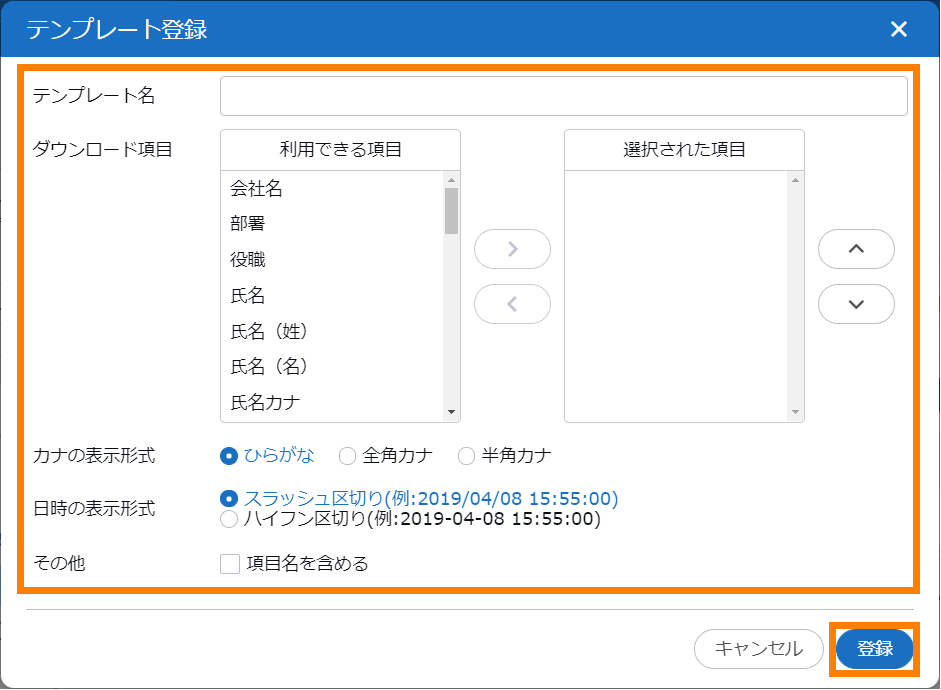 | 項目名 | ファイルに項目名を含める場合はチェックを入れてください。 |
