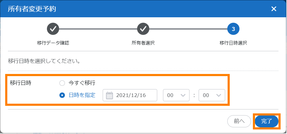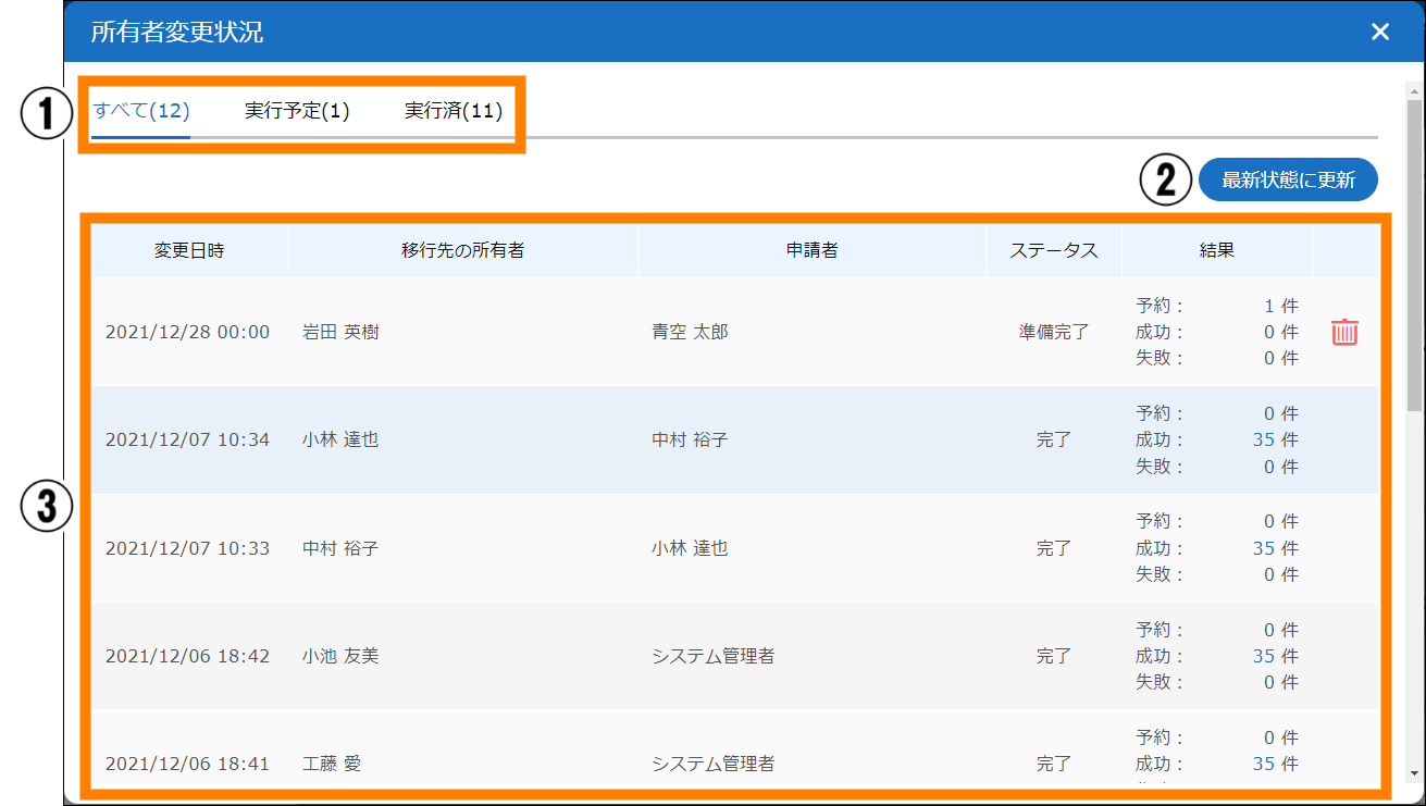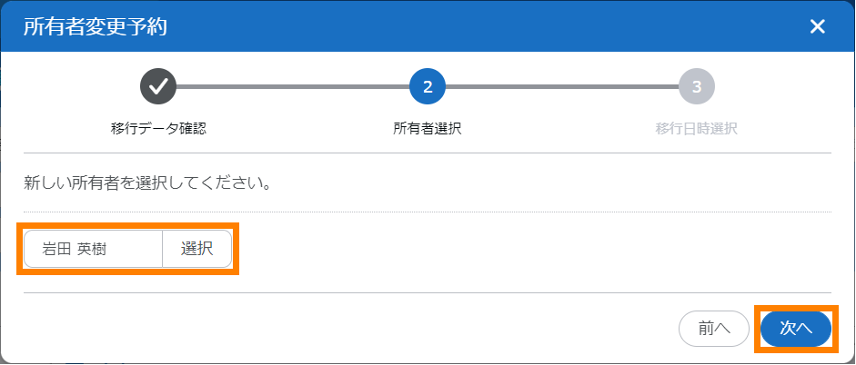 | 所有者で絞り込み | クリックすると表示される画面で、一覧に表示される候補を所有者または部署で絞り込めます。所有者で絞り込む場合は「ユーザー選択」、部署で絞り込む場合は「部署選択」をクリックします。 | ||