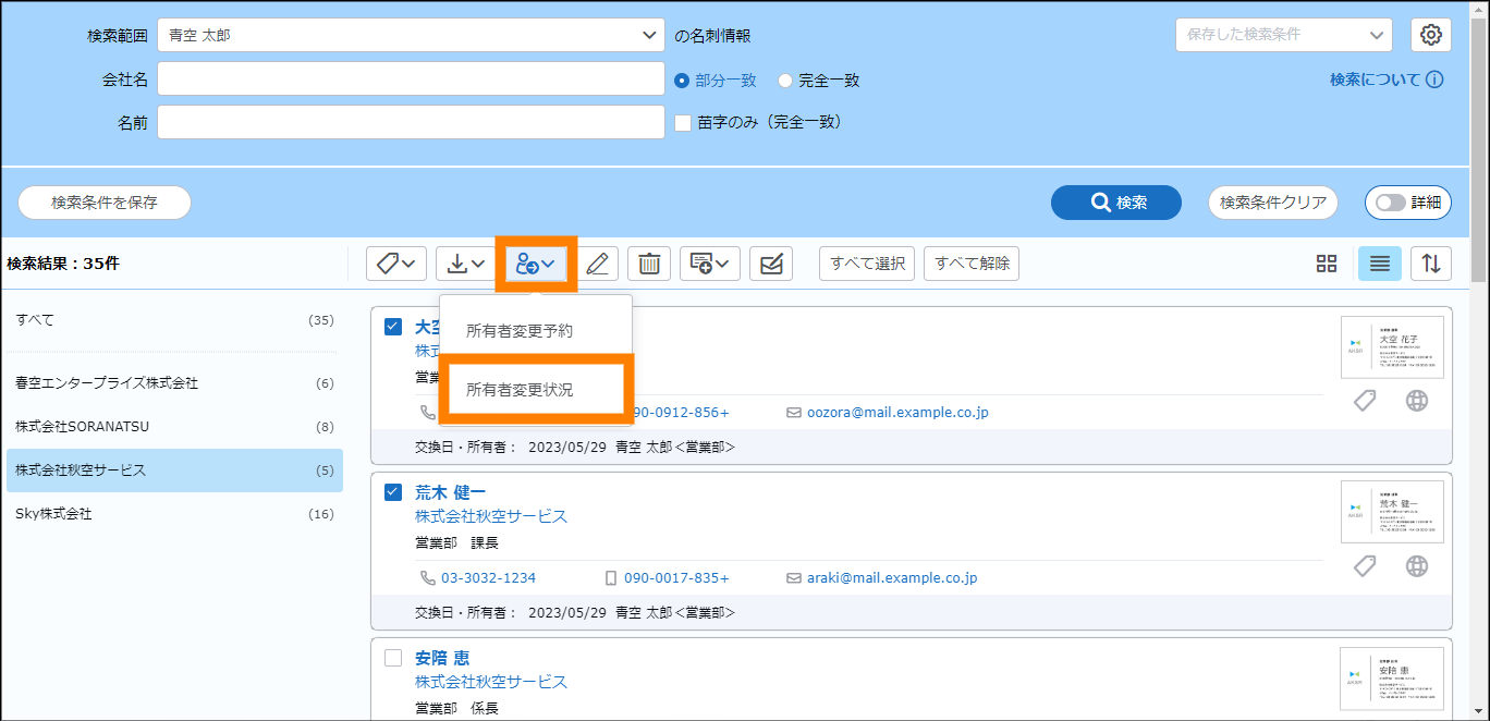 - 「検索対象(同一人物の検索対象結果)」で「名刺所有者毎の最新を表示」または、「組織全体の最新のみ表示」を選択して検索した