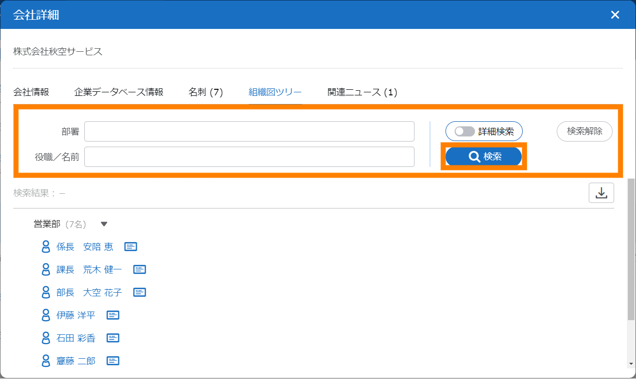 | 部署 | 入力したキーワードと一致する部署で検索できます。 | |