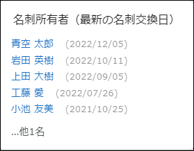 にマウスポインターを合わせると、その名刺の所有者の一覧が表示されます。所有者の一覧は、名刺交換日が新しい順に5件まで表示されます。所有者の氏名にマウスポインターを合わせると、社員情報が表示されます。