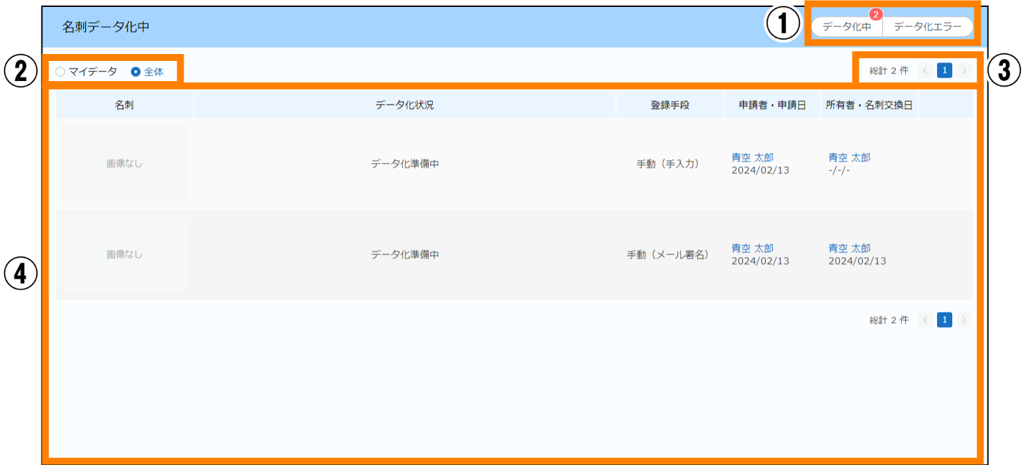 | ④ | データ化状況 | 名刺のデータ化状況が表示されます。 | ― |