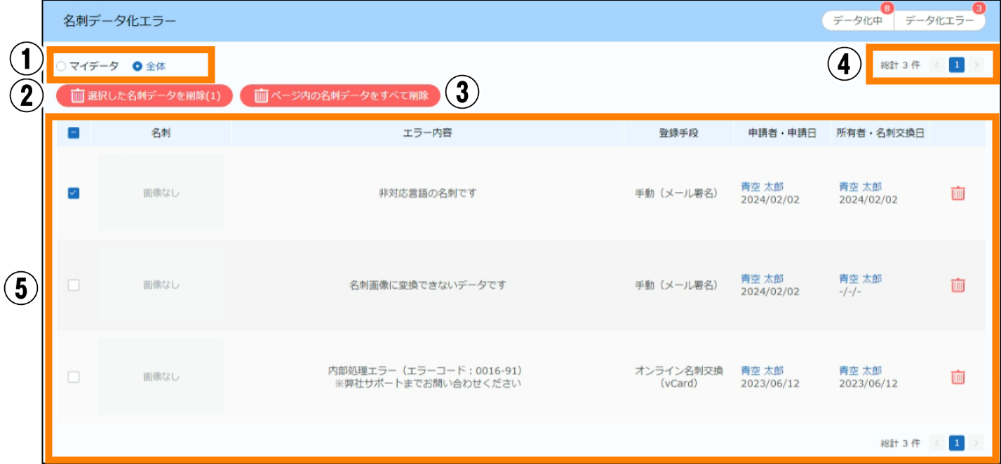 | ② | 選択した名刺データを削除 | クリックすると、⑤で選択したエラーの発生した名刺データが削除されます。 |