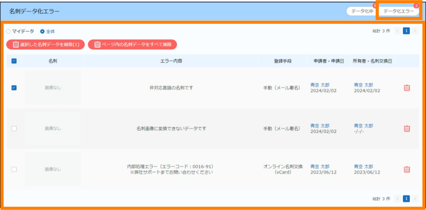 - エラーの発生したデータを選択し、まとめて削除する場合は、対象のデータにチェックを入れ、[選択した名刺データを削除]をクリックしてください。