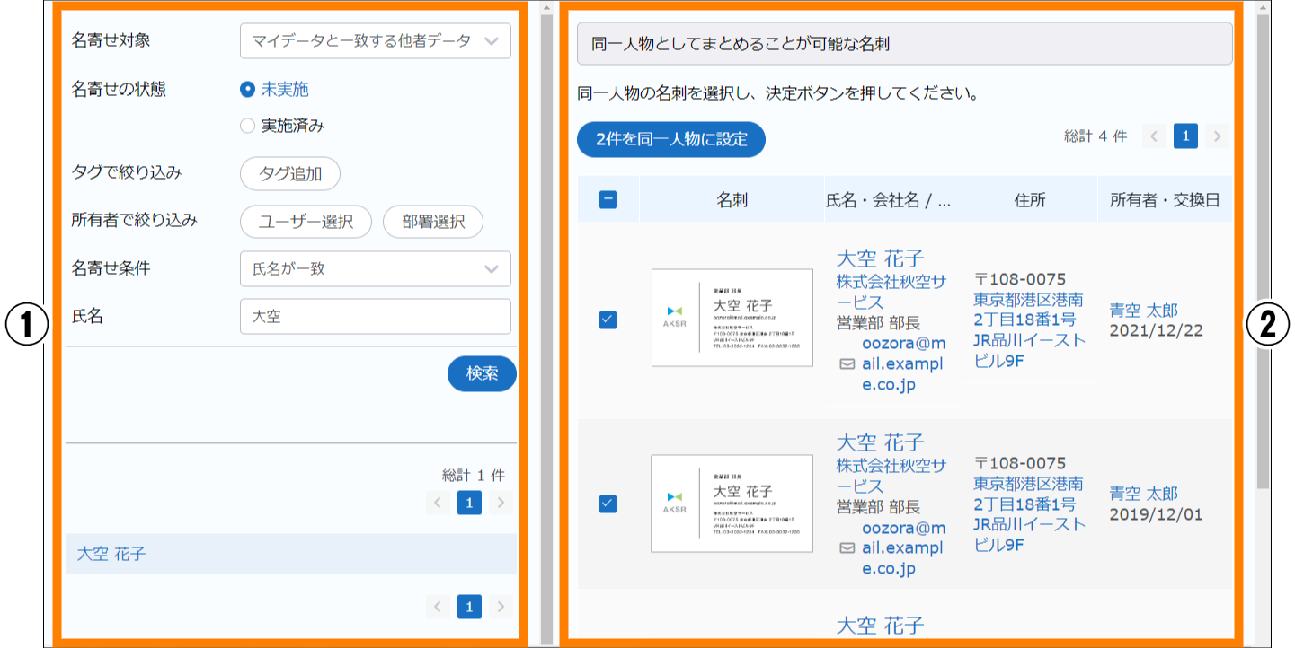 | ② | 同一人物としてまとめることが可能な名刺 | 対象候補一覧で選択した候補の詳細が表示されます。同一人物としてまとめる名刺情報にチェックを入れ、[●件を同一人物に設定]をクリックしてください。「●」には数値が入ります。 | |