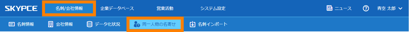 ① 「名刺 / 会社情報」をクリックし、「同一人物の名寄せ」をクリックする。