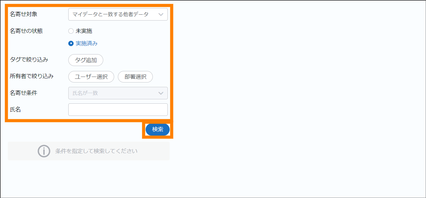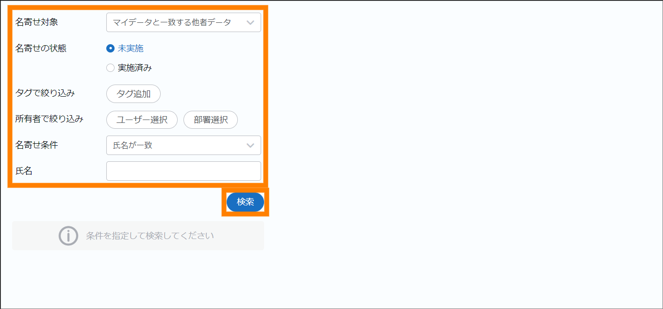 | 名寄せの状態 | 一覧に表示される候補が名寄せの状態で選択できます。選択できる項目は、「未実施」「実施済み」です。 | ||
