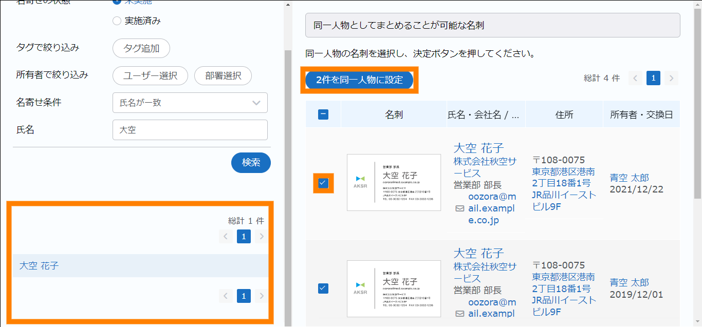 ③ 候補を選択し、名寄せする名刺情報にチェックを入れ、[●件を同一人物に設定]をクリックする。