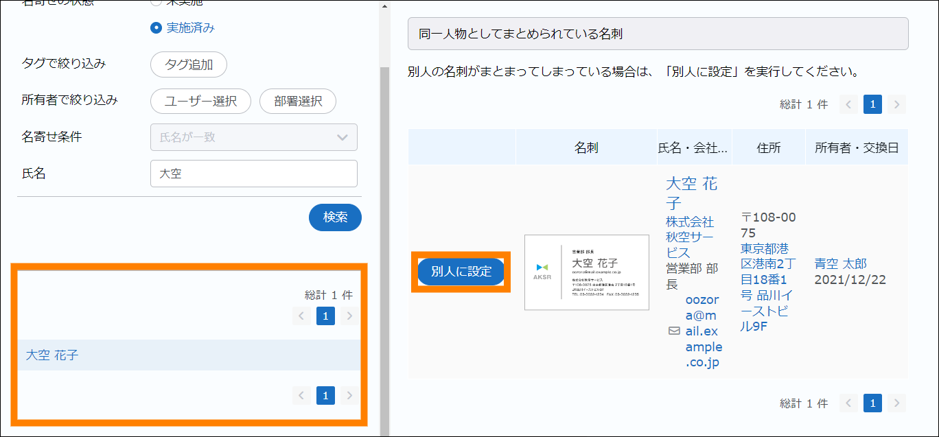 ② 候補を選択し、名寄せを解除する名刺情報の[別人に設定]をクリックする。