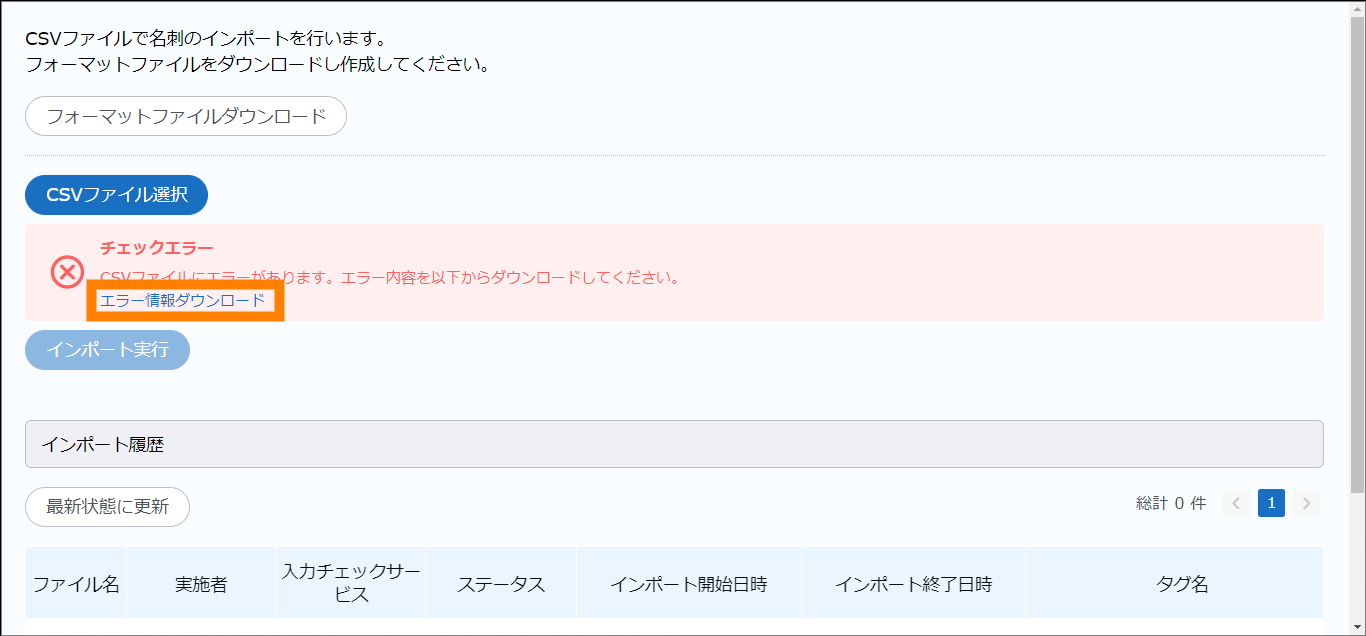 ファイルの内容に不備がある場合は、エラー画面が表示されます。エラーの内容の詳細については、「エラー情報ダウンロード」をクリックするとダウンロードできるファイルを確認してください。