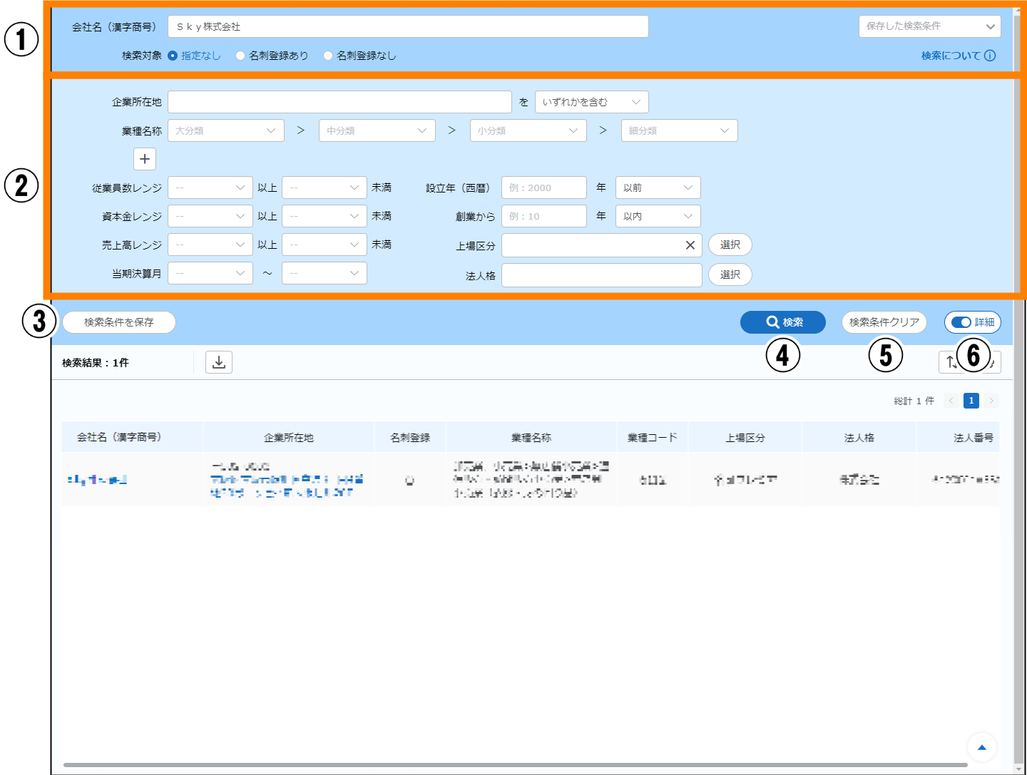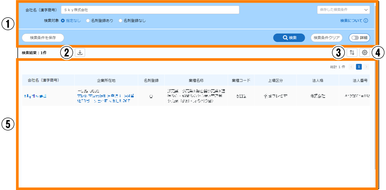 | ⑤ | 企業データベース情報一覧 | 企業データベースの検索結果が一覧で表示されます。 | ― |