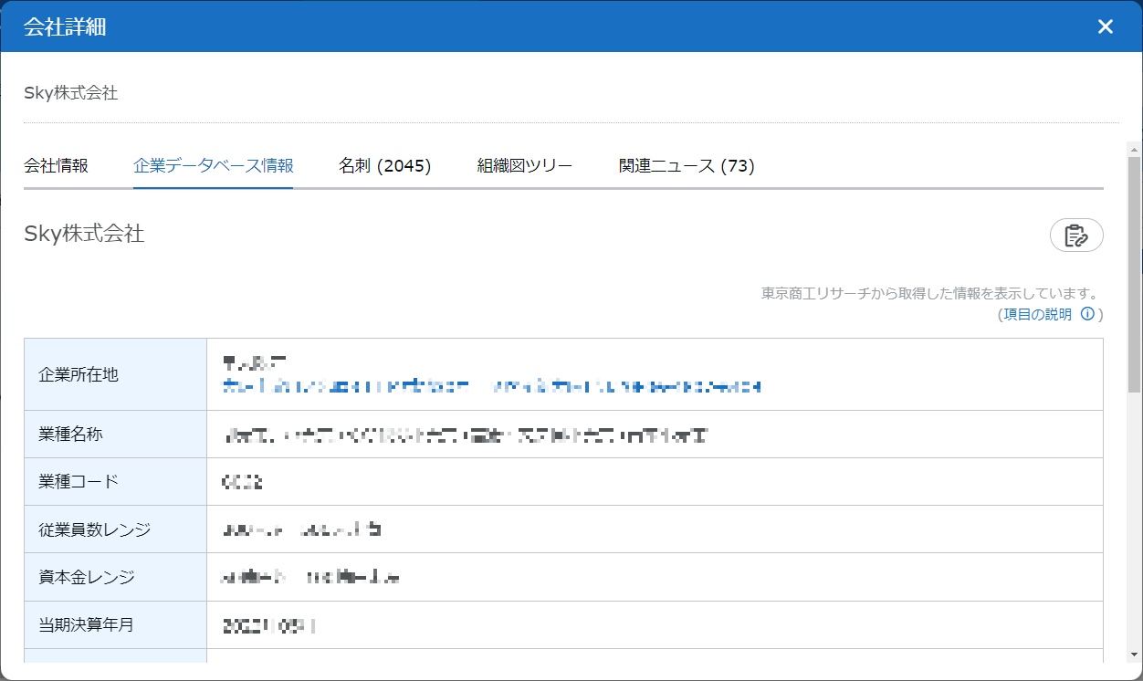 - 画面上部の「関連ニュース」をクリックすると、会社情報と紐づいたニュースが確認できます。詳しくは、「3.5. ニュースを表示する」を参照してください。