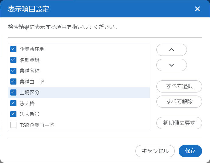 - 「会社名(漢字商号)」以外の項目は、リストの上の項目から順番に表示されます。順番を変更する場合は、項目を選択し、
