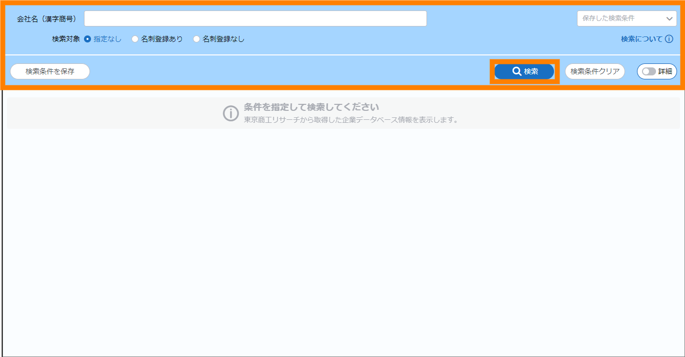 | 保存した検索条件 | クリックすると表示されるリストから、保存されている検索条件の読み込みができます。前回の検索条件を選択することもできます。 | ||