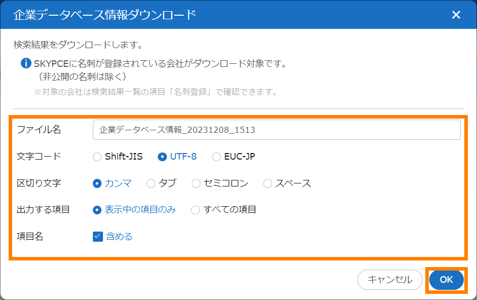 企業データベースの情報を一括でダウンロードします。ダウンロードするファイルは、文字コードや区切り文字の指定もできます。