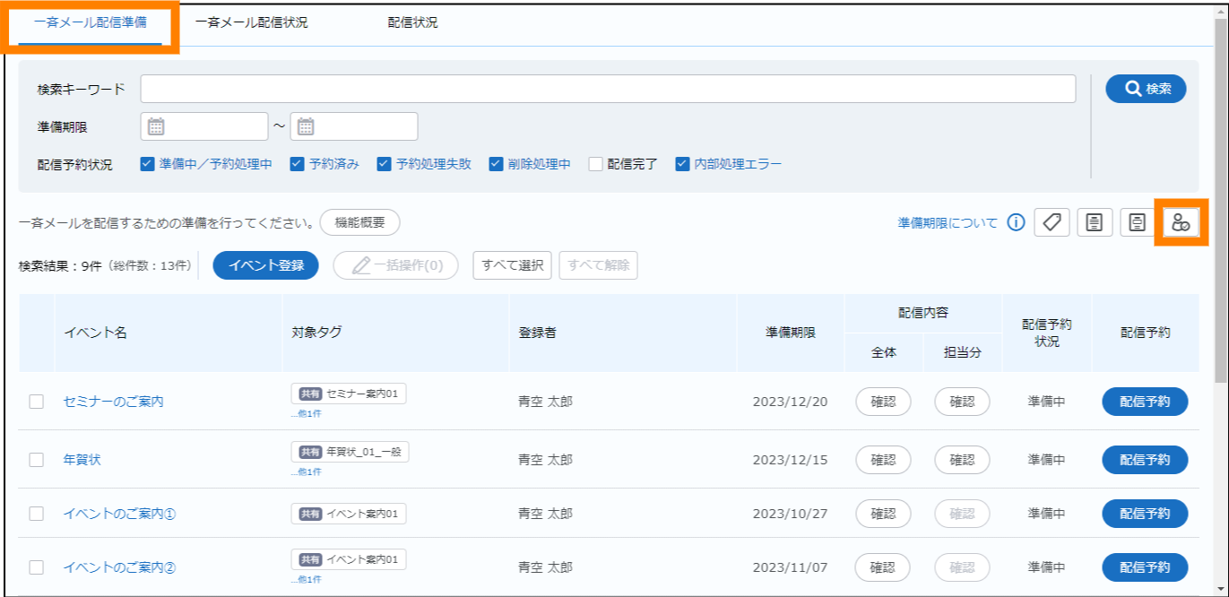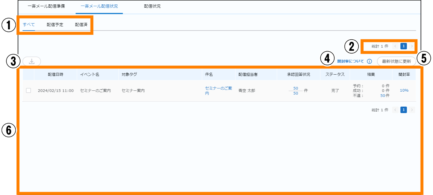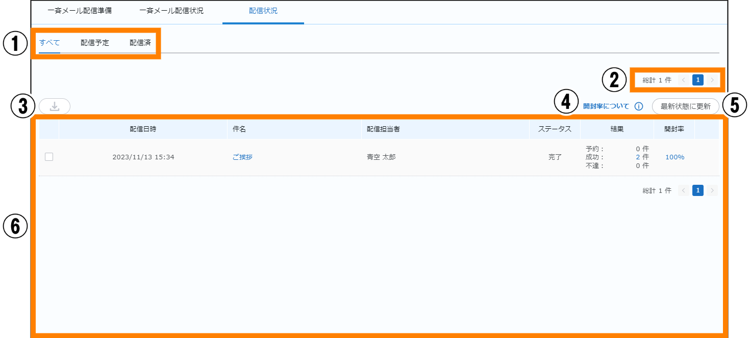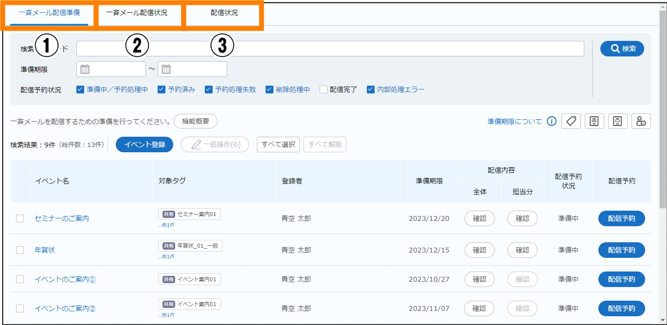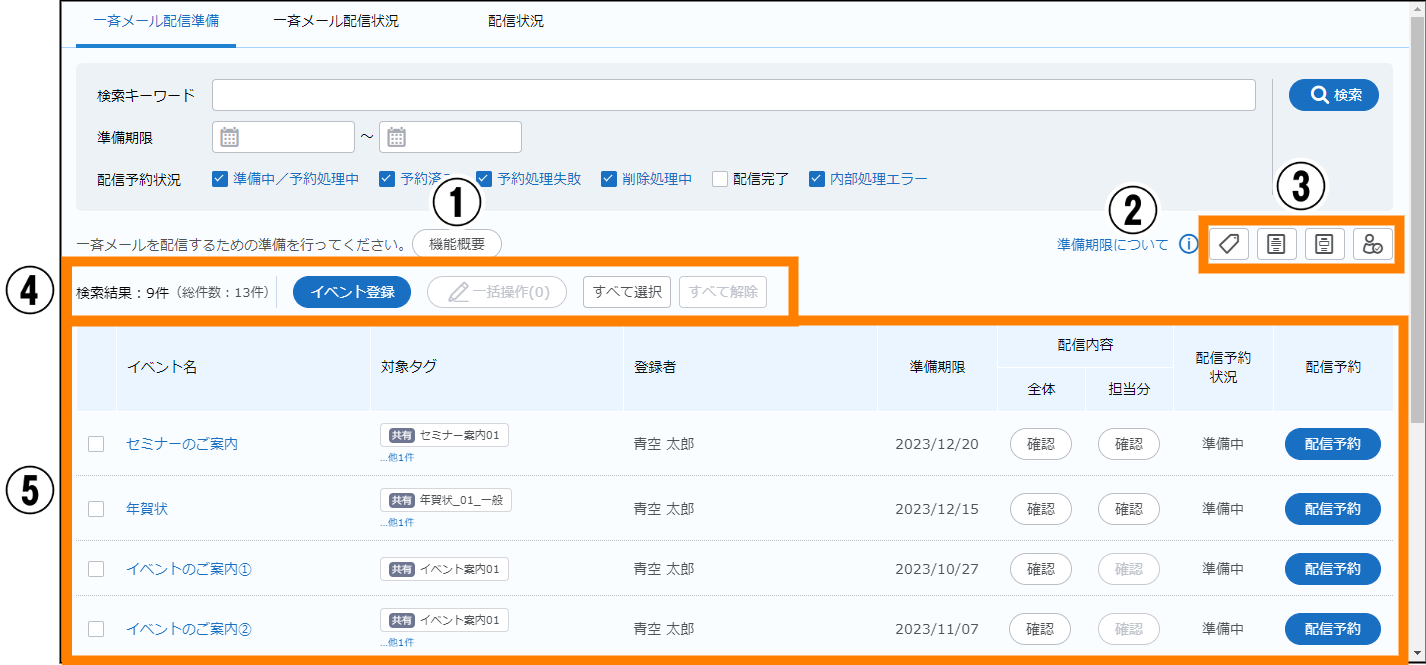 | ② | メール配信 | 共有タグを指定してメールを配信できます。メールの配信状況を確認することもできます。 | 参照 |