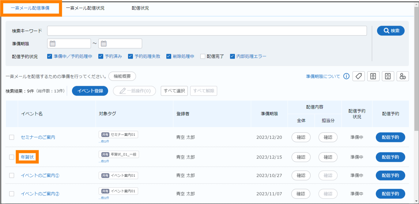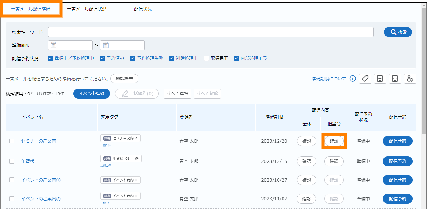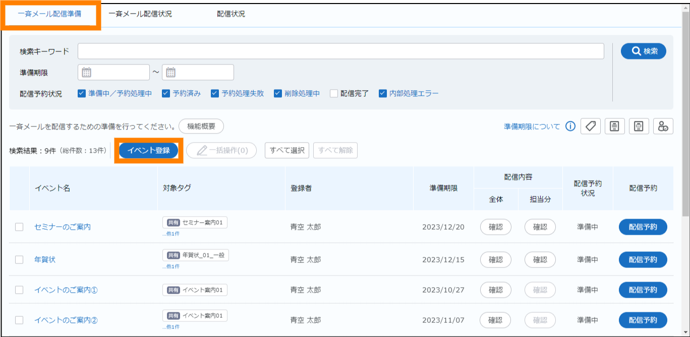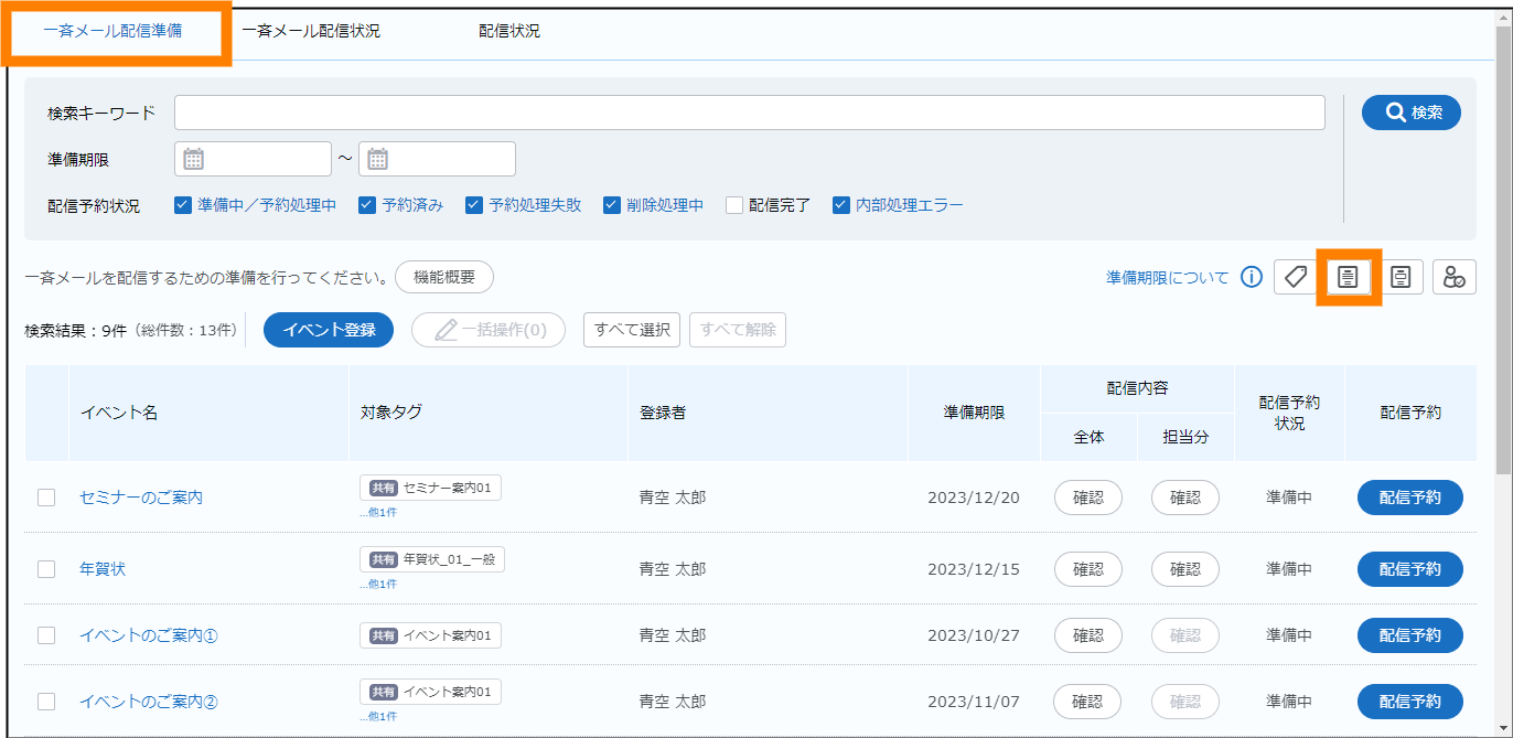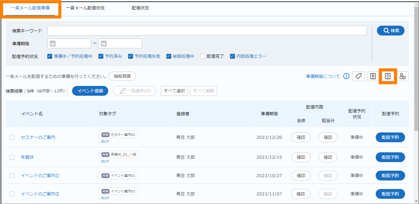 | ② | メール配信 | 共有タグを指定してメールを配信できます。メールの配信状況を確認することもできます。 | 参照 |