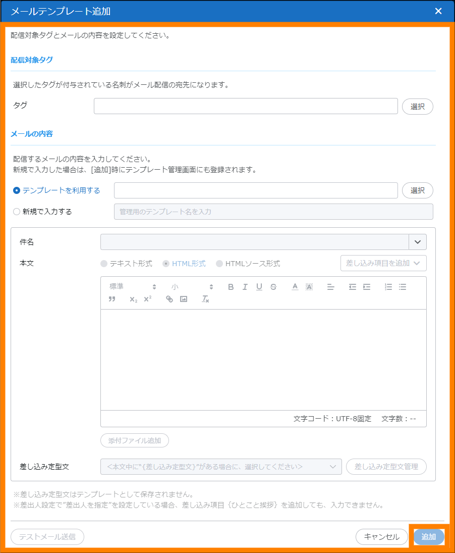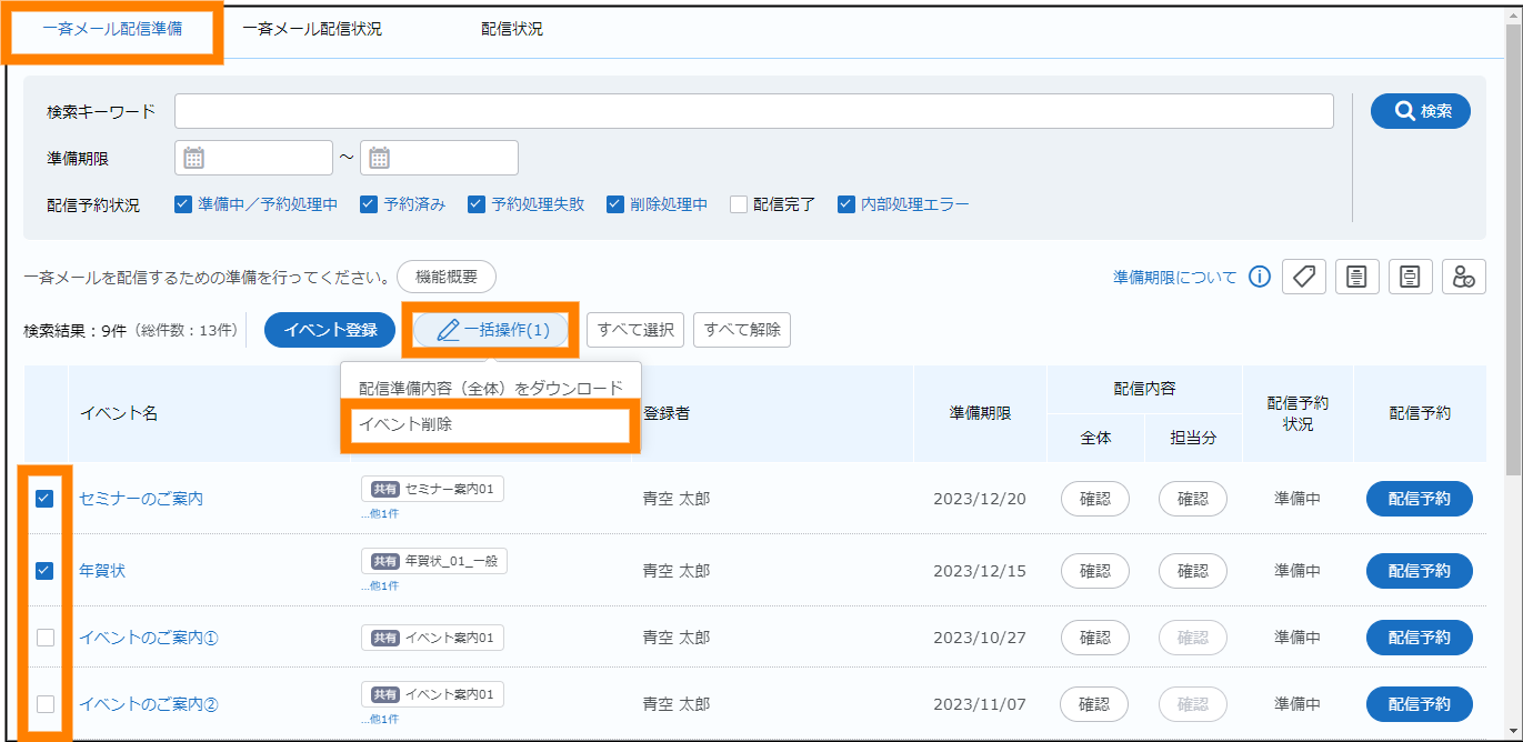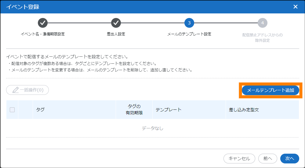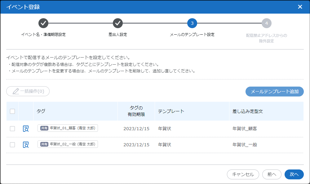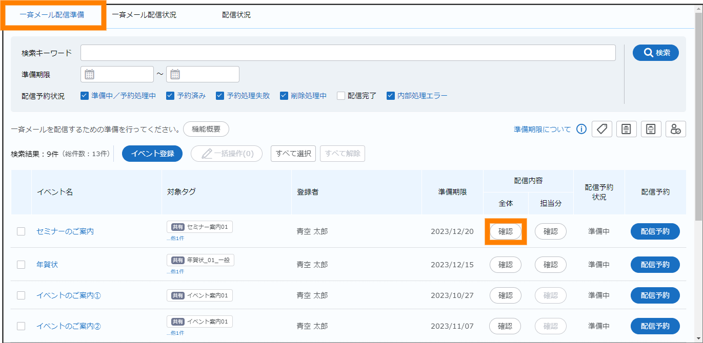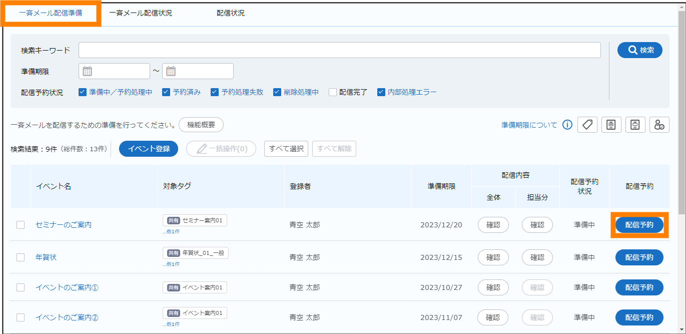 | ② | メール配信 | 共有タグを指定してメールを配信できます。メールの配信状況を確認することもできます。 | 参照 |