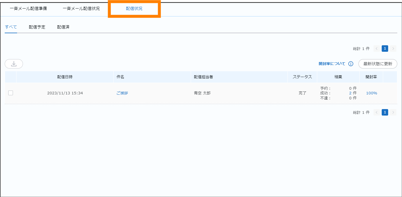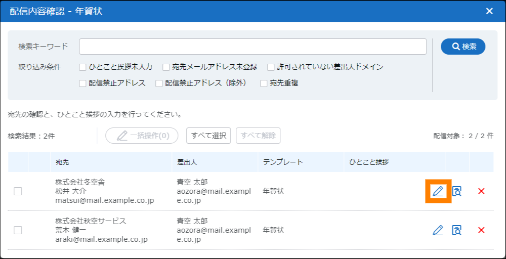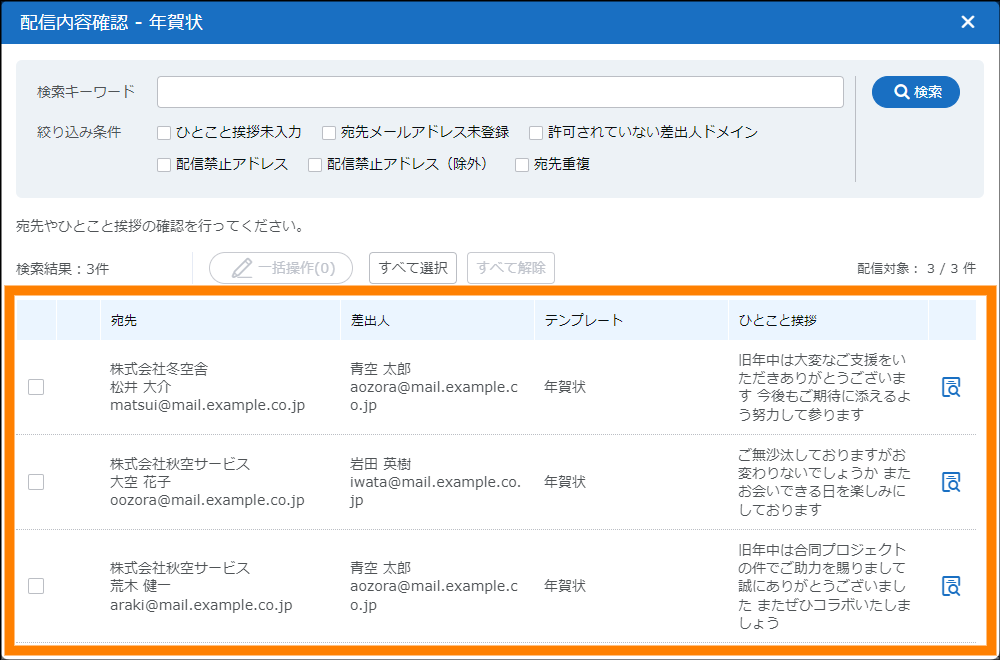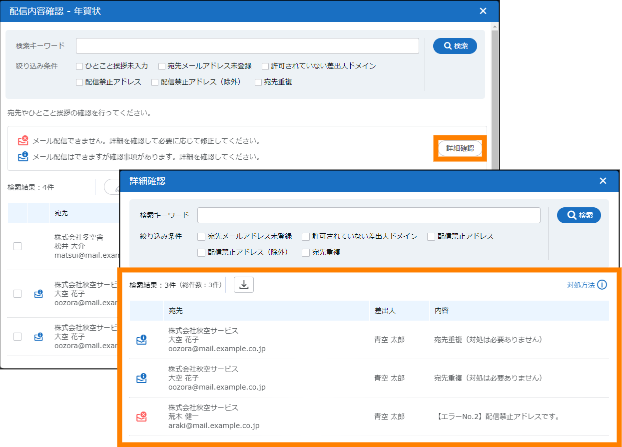 - 「前回の送信日時」に、以前メールを送信したことのある宛先について、メールを送信した日時が表示されます。不達となったメールには、赤字で詳細が表示されます。