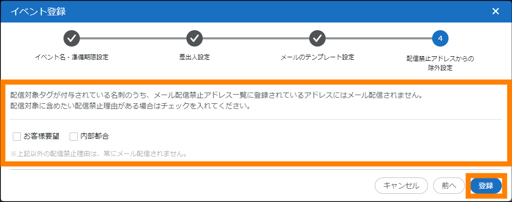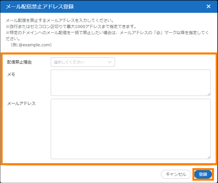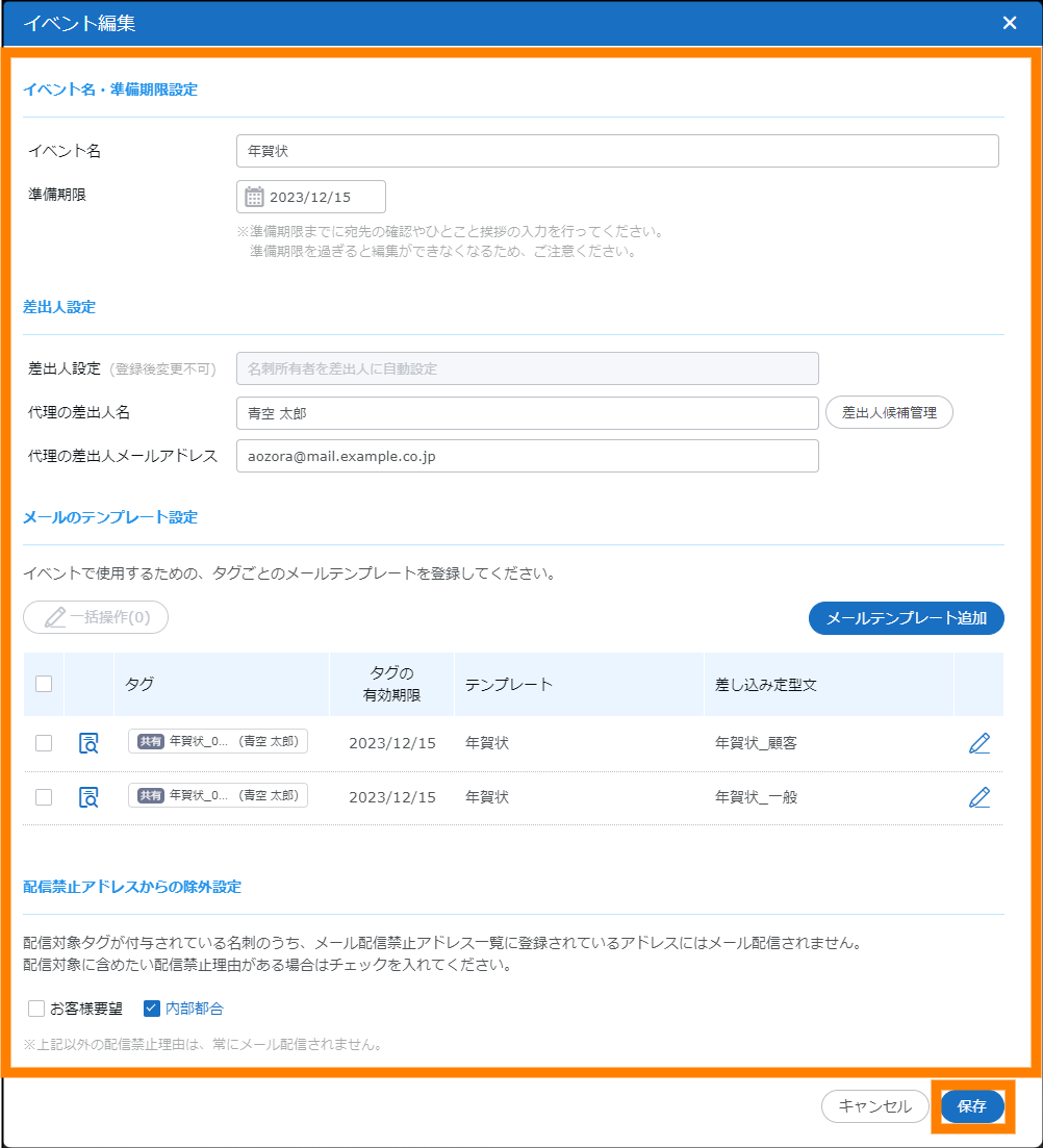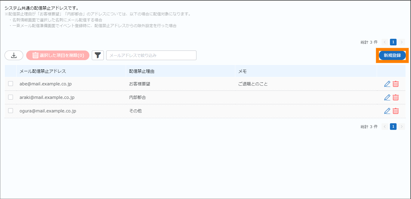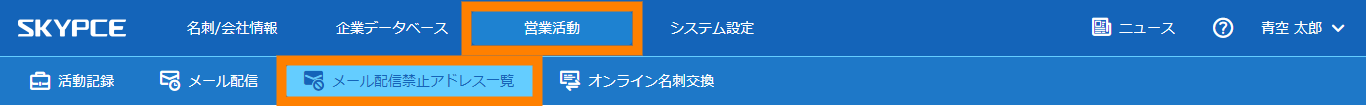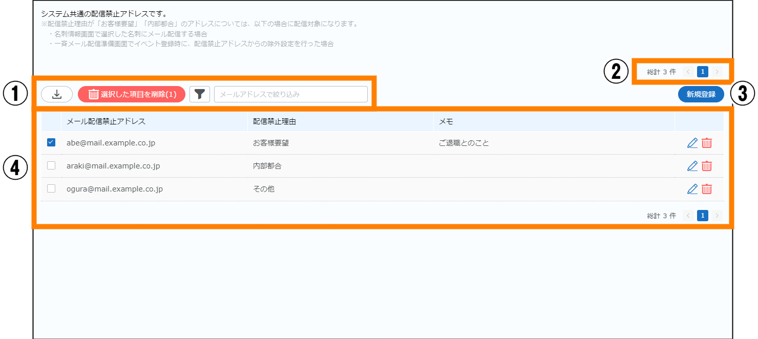 | ③ | メール配信禁止アドレス一覧 | 「選択した名刺にメール配信」および、「一斉メール配信」でメール配信を禁止するメールアドレスの設定ができます。 | 参照 |