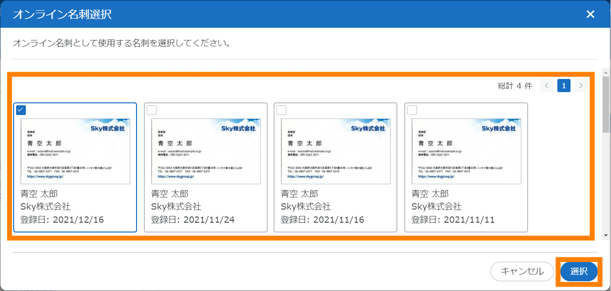 ② オンライン名刺として登録する名刺を選択し、[選択]をクリックします。