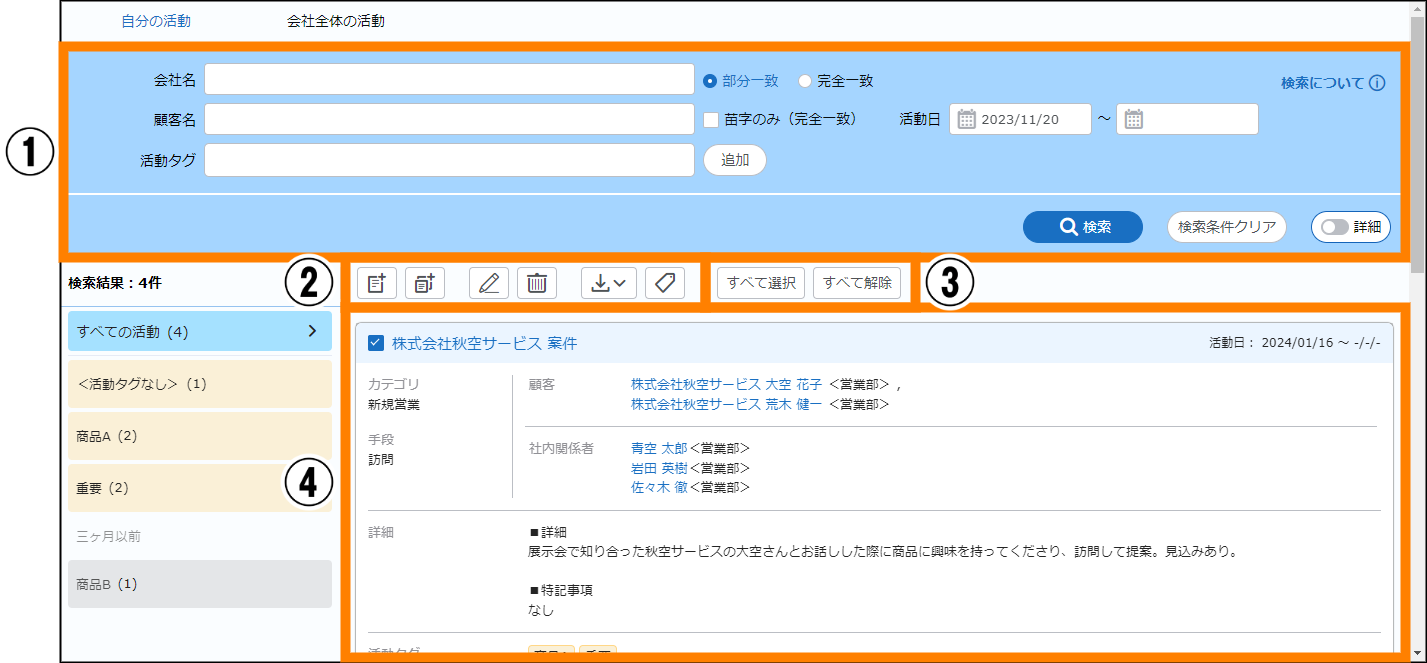 | ① | 自分の活動 | クリックすると、社内関係者に自分(ログインしたユーザー)が設定されている活動記録のみが表示されます。 | |