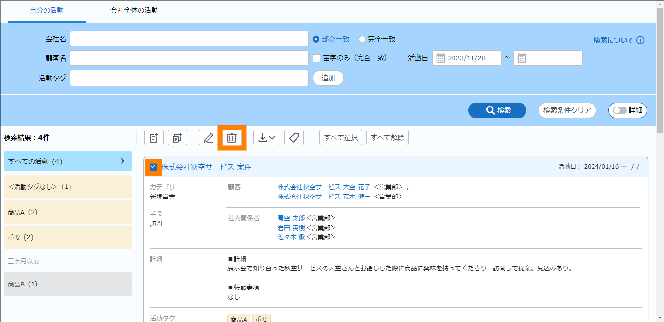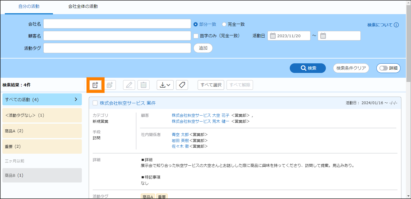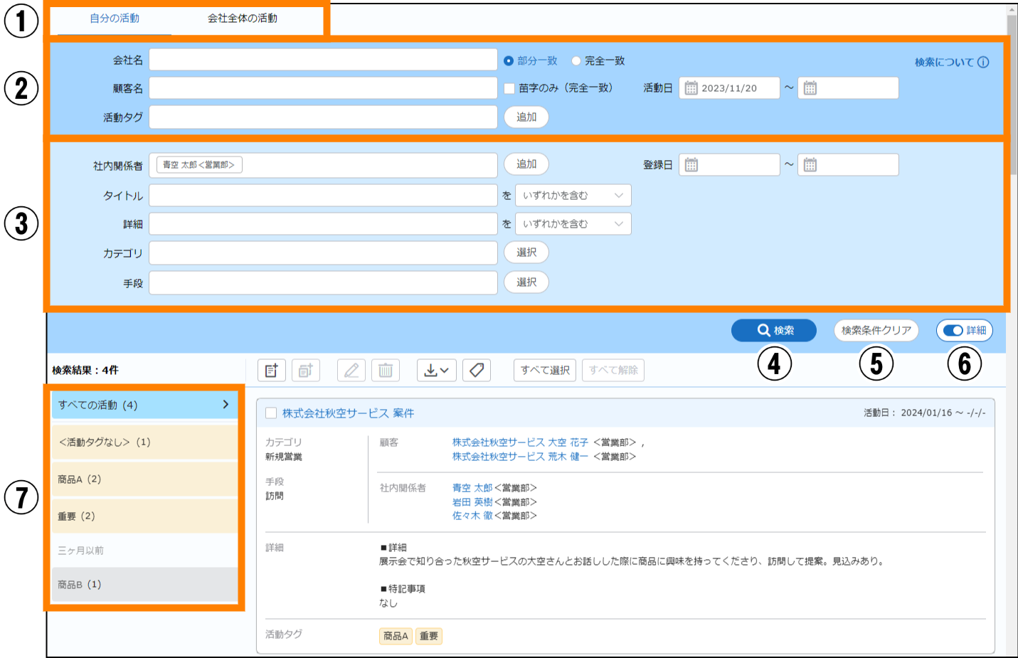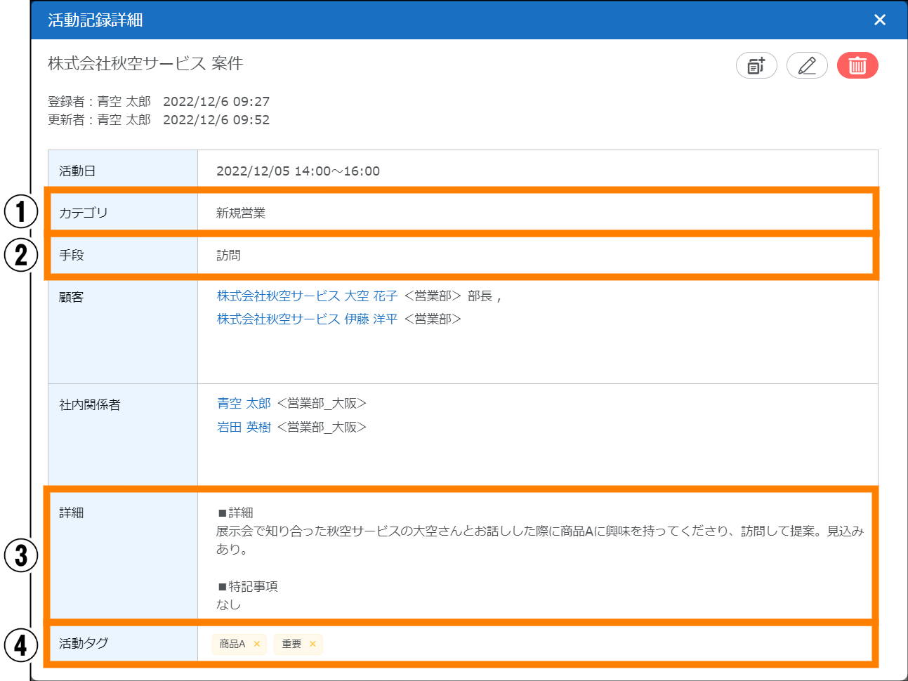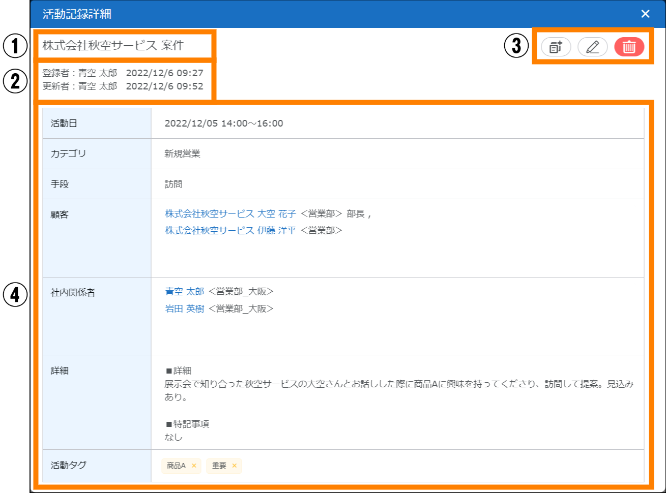 | ④ | 活動タグ | 視認性や検索性を向上させるためのタグを付与します。1つの活動記録に対し複数付与できます。 例 : 「重要」「商品A」「商品B」「セミナー参加済み」「商談中」「受注見込み」 |