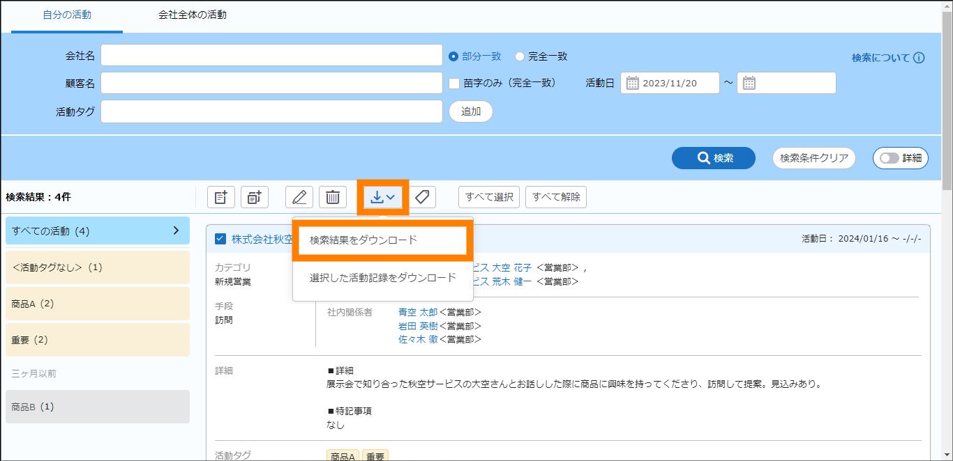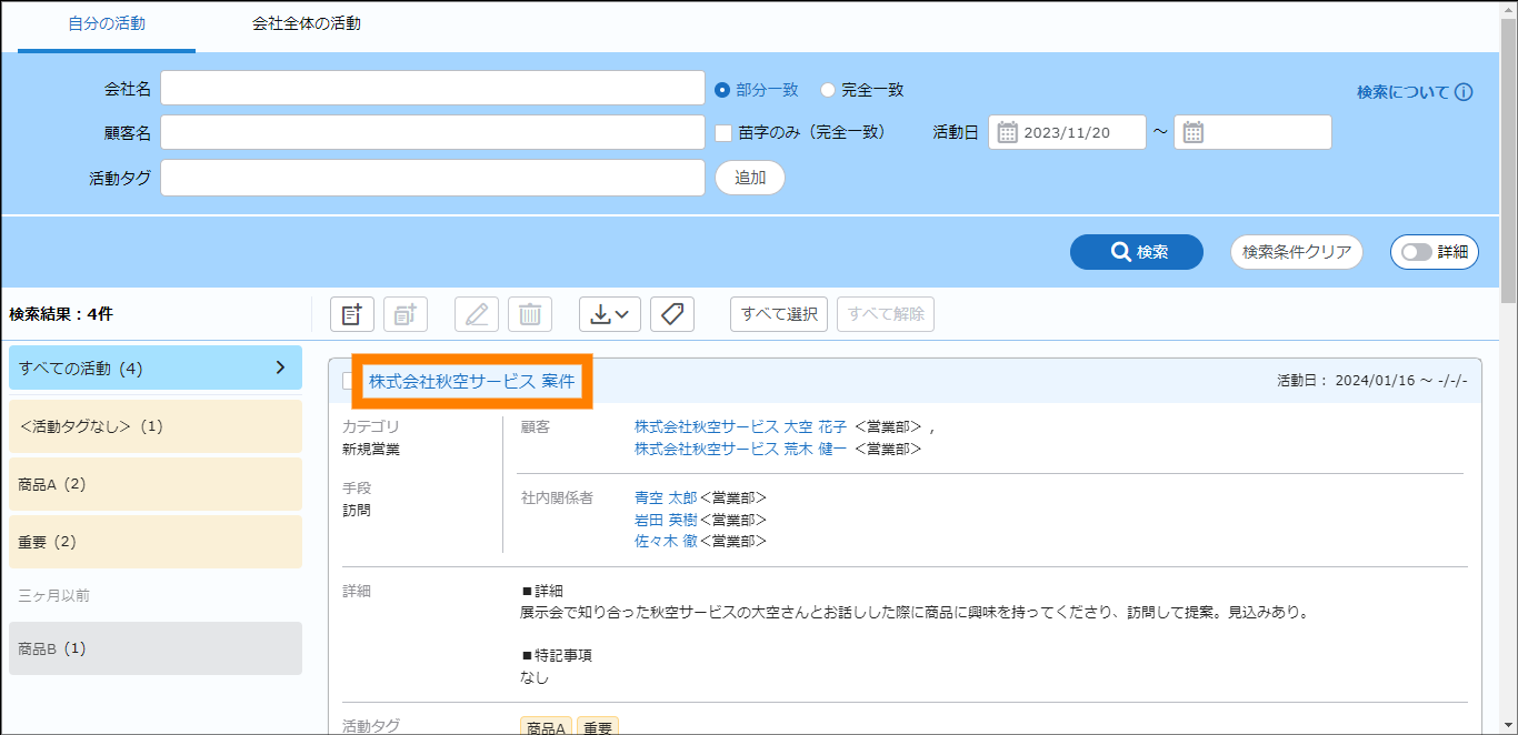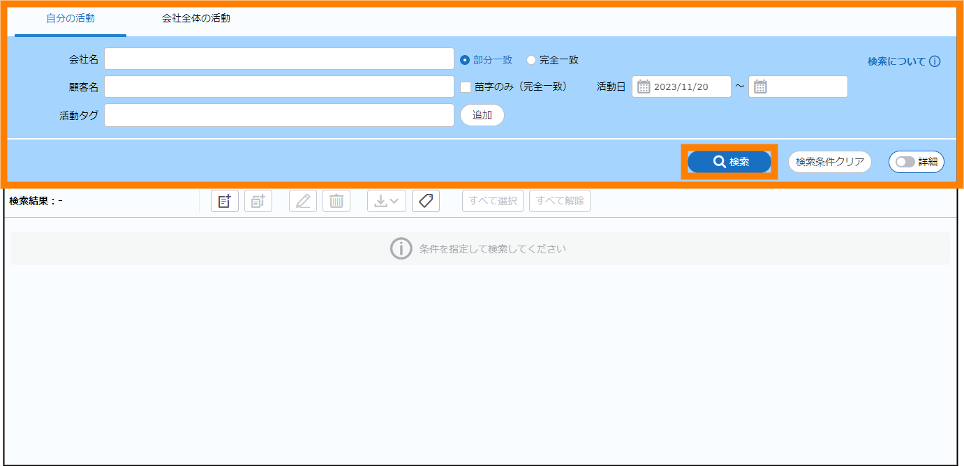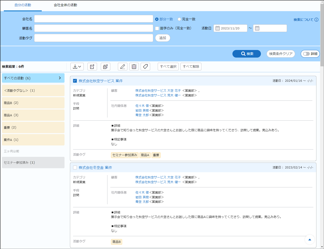 活動記録を検索・閲覧します。活動記録は、会社名、顧客名などのキーワードを入力して検索できます。また、詳細検索を使うことでさらに検索結果を絞り込むことができます。