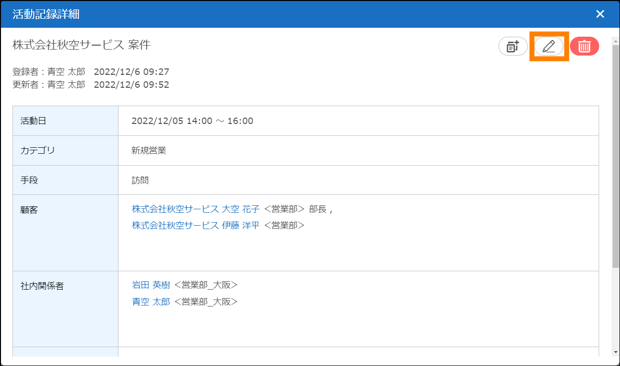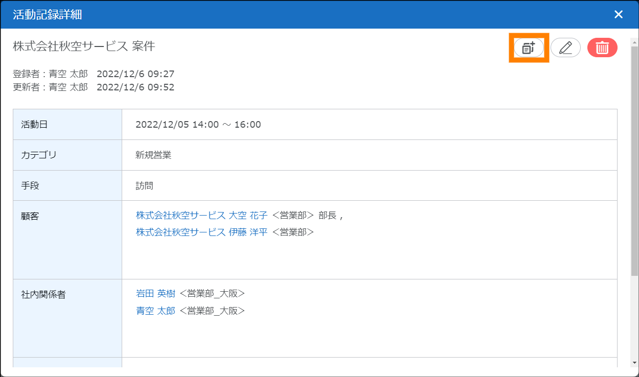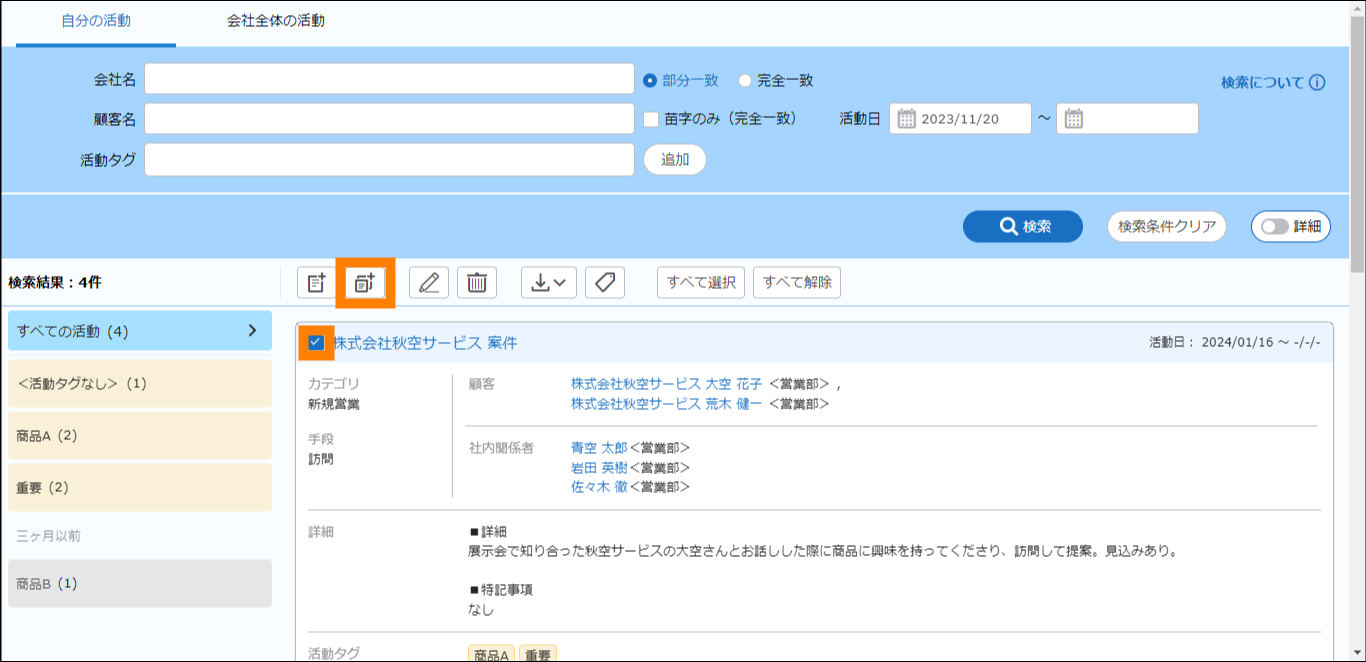 さらに、活動記録は、案件管理にも活用できます。案件の進捗や状況の変化があった場合には、活動記録を編集したり、活動記録をコピーして新しく登録したりできます。