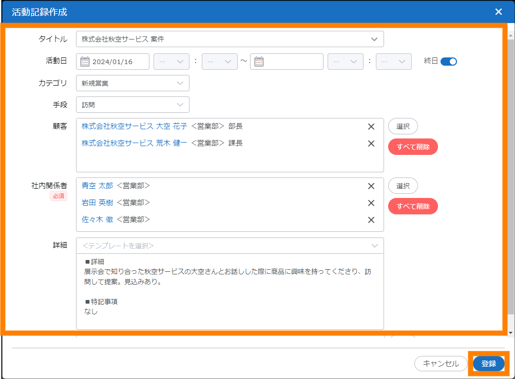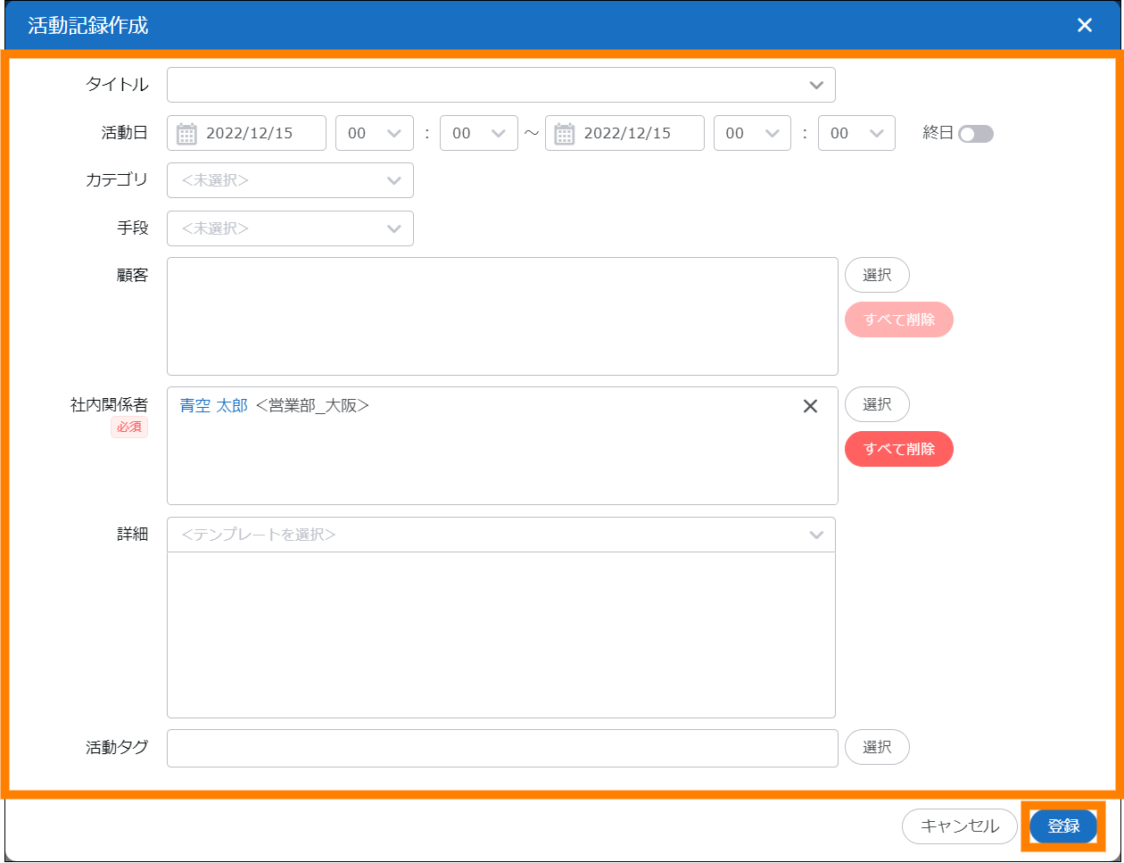 活動記録を新規登録します。「タイトル」「活動日」「カテゴリ」「手段」「顧客」などの情報を登録できます。