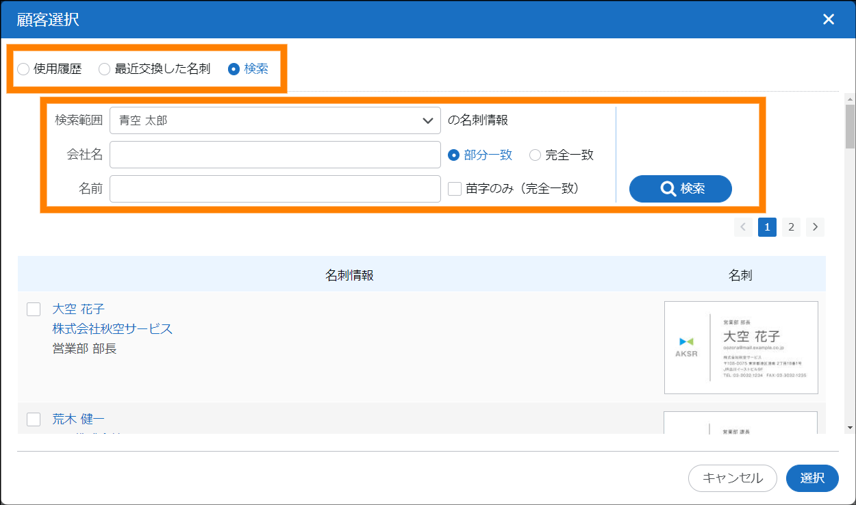 - 名刺候補が複数ある場合は、[他の名刺を選択]をクリックすると表示される画面で、登録する名刺を選択し、[選択]をクリックしてください。
