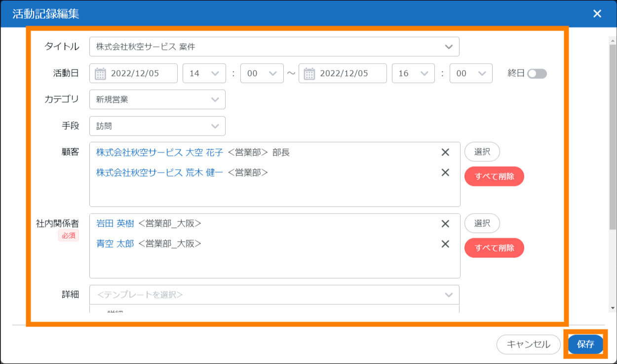 | ③ | 詳細 | 活動に関する詳細情報を入力します。管理者によってテンプレートが設定されている場合は、テンプレートを選択して入力することもできます。 例 : 活動の目的や詳細、メモ、特記事項 |
