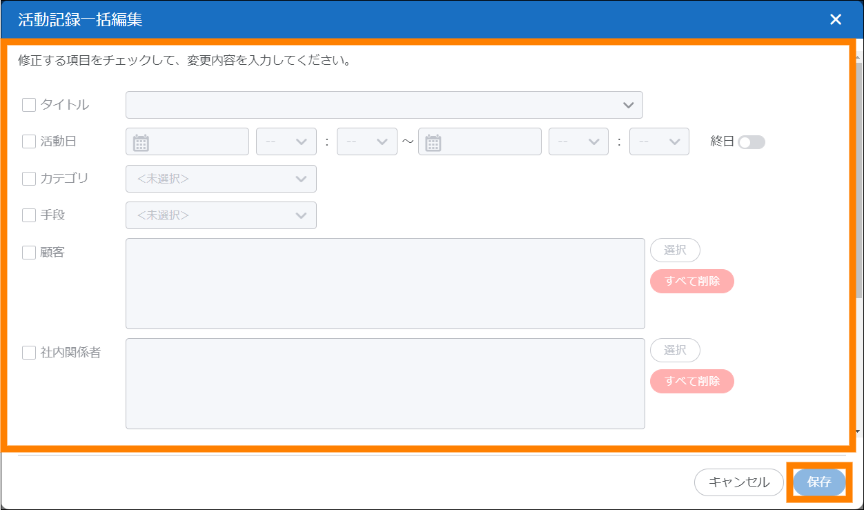 | ① | カテゴリ | 活動をカテゴリ分けします。管理者によって設定されたリストから選択します。 例 : 「新規営業」「既存営業」「提携」「サポート」「その他」 |
