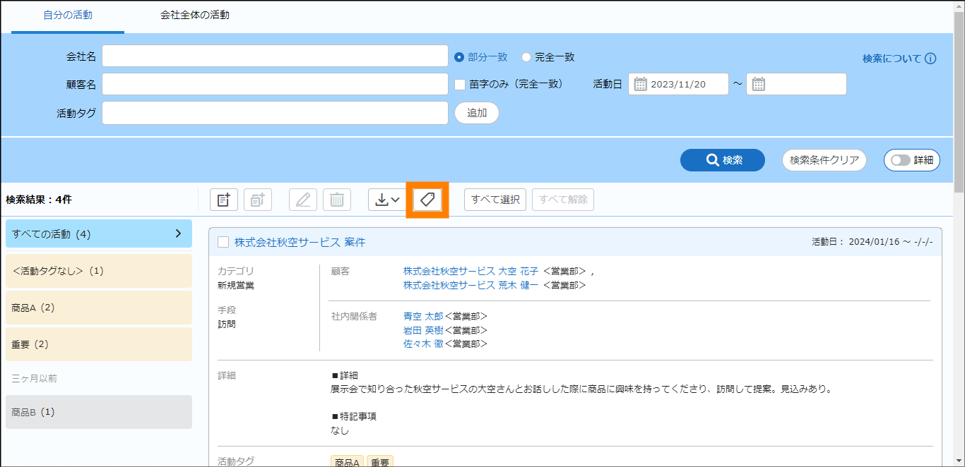 また、名刺が登録されている人物を「顧客」として設定でき、名刺情報と活動記録を紐づけすることができます。活動タグを付与することで複数の活動記録をグループ化することもできます。