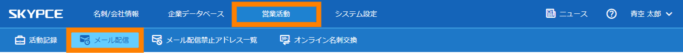 「営業活動」画面の各項目について説明します。「営業活動」画面では、営業活動の記録の閲覧・登録や、メールの配信などができます。各項目の詳細については、参照先を確認してください。