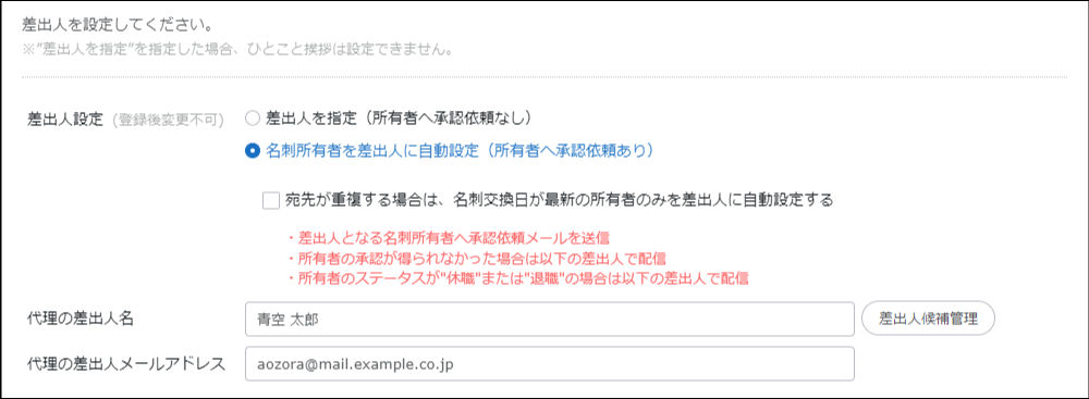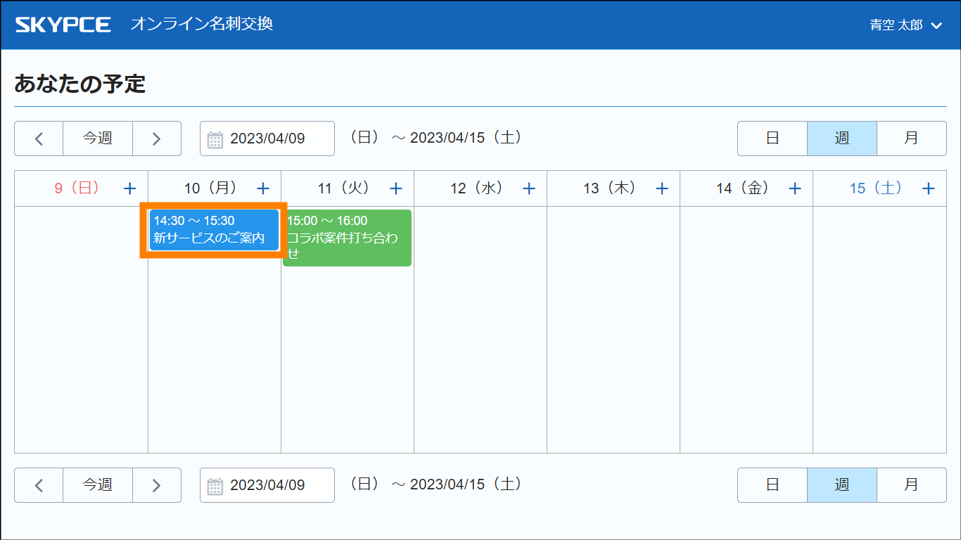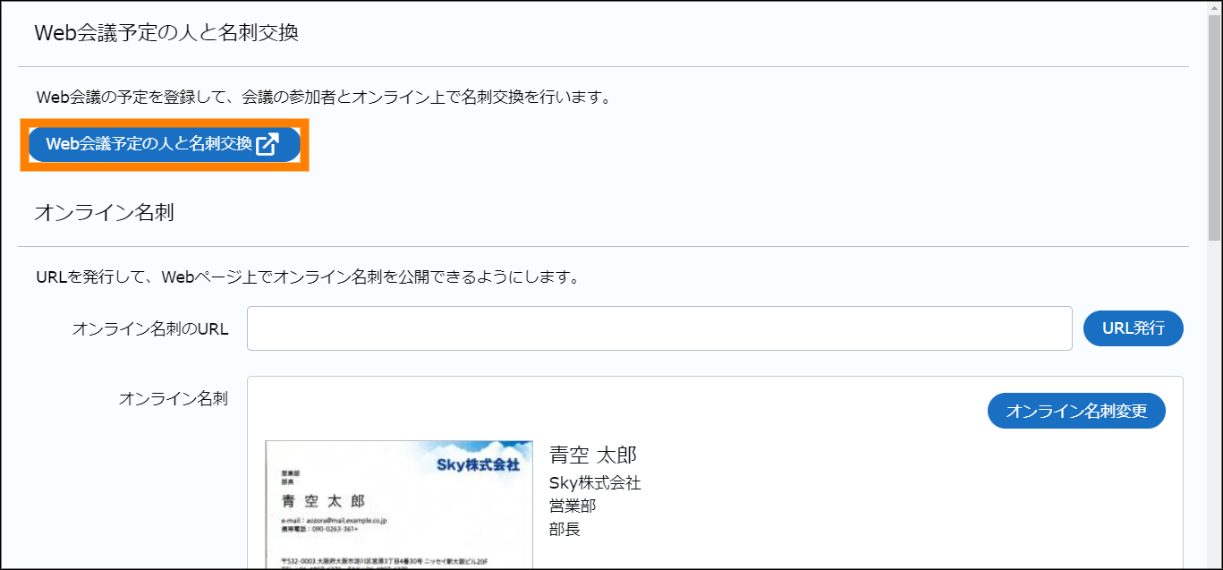 - 本機能は名刺を送るのみで、相手に名刺を送り返してもらうことはできません。相手に名刺を送り返してもらいたい場合は、「3.4.4.1. Web会議予定の人とオンライン名刺交換をする」を参照してください。