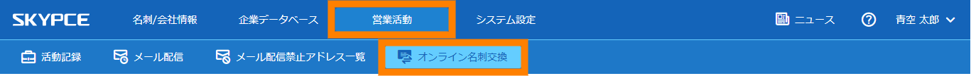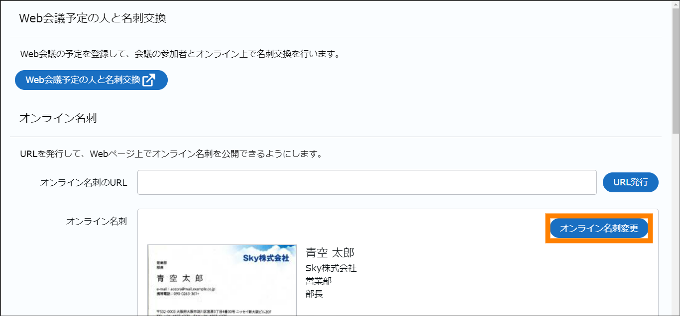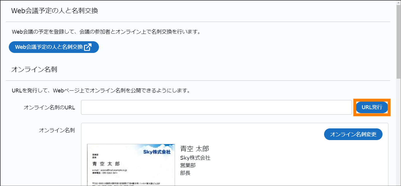 - オンライン名刺のURLを発行するためには、あらかじめ自分(ログインしたユーザー)の最新の名刺をSKYPCEに登録し、オンライン名刺として登録しておいてください。オンライン名刺の登録方法については「3.4.4.3. オンライン名刺を登録、変更する」を参照してください。