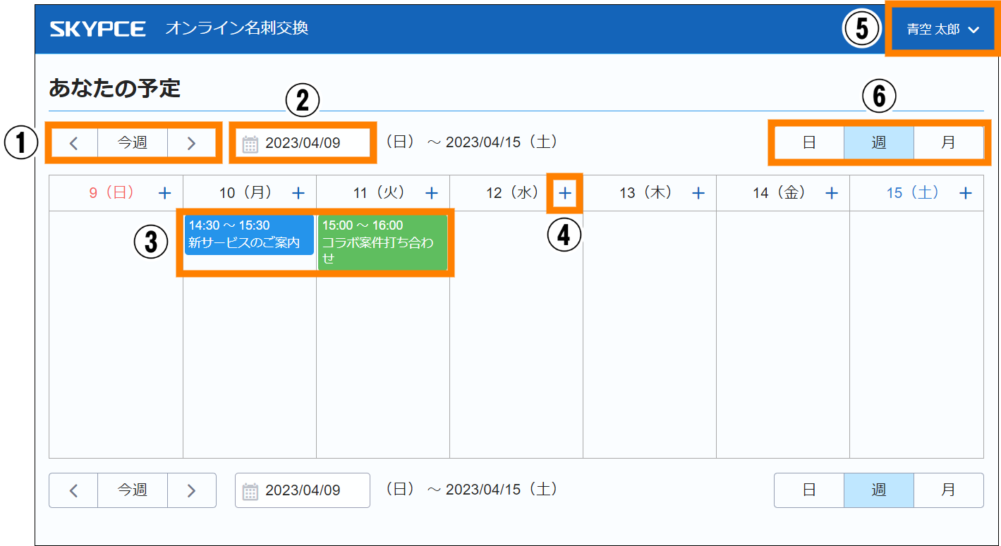 | ⑥ | 表示切り替え | 月、週、日の表示の切り替えができます。 |