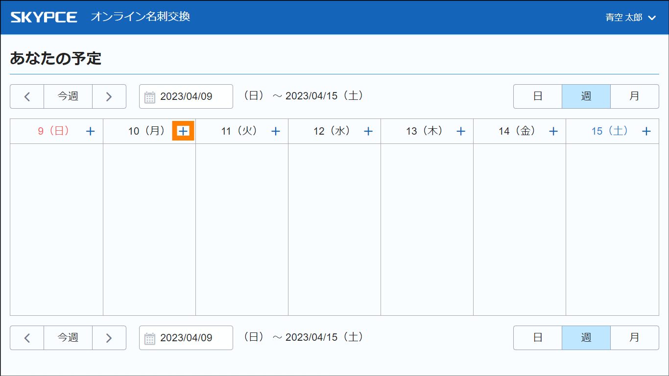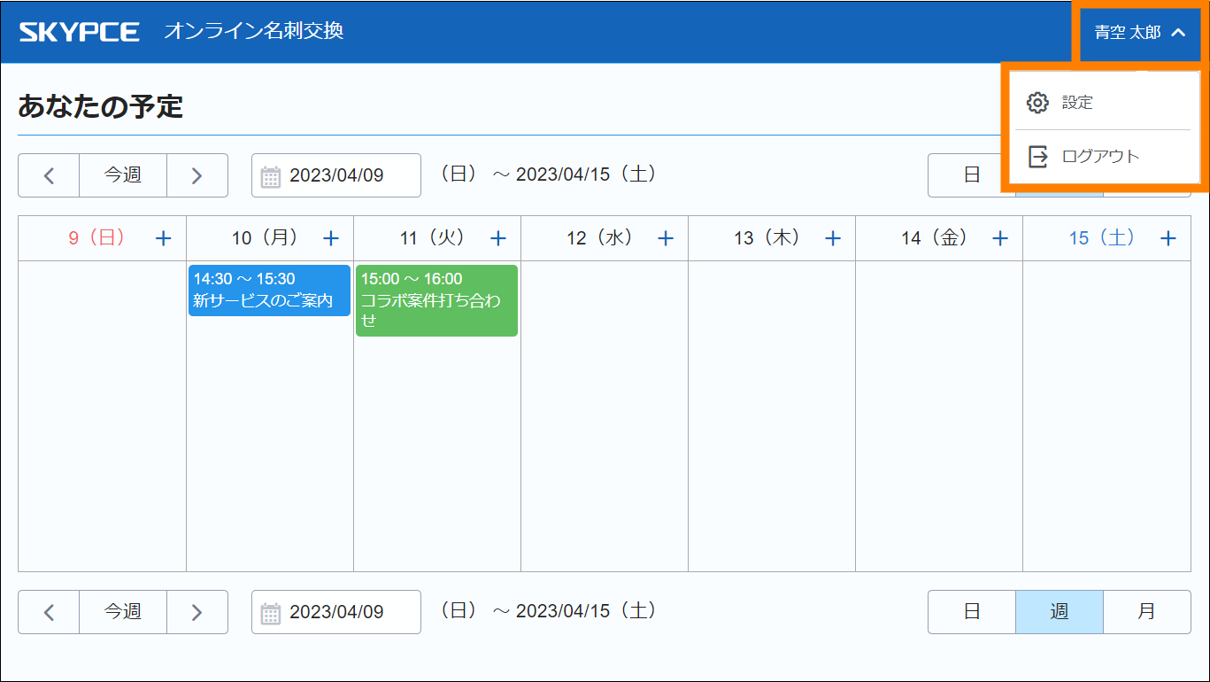 - 予定表の開始曜日を変更する場合は、ログイン中のユーザー名をクリックし、「設定」をクリックしてください。選択できる項目は、「日曜日」「月曜日」です。