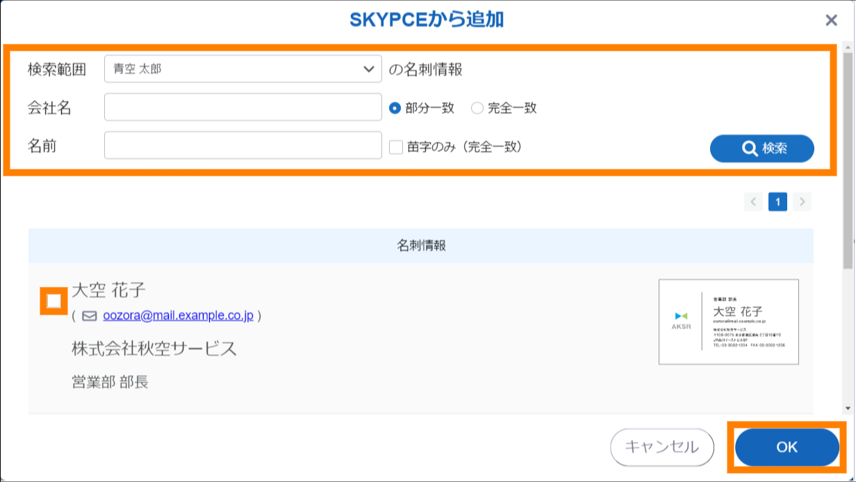 - [SKYPCEから追加]から参加者を追加する場合、次の画面が表示されます。必要に応じて検索を実行し、参加者にチェックを入れて[OK]をクリックします。