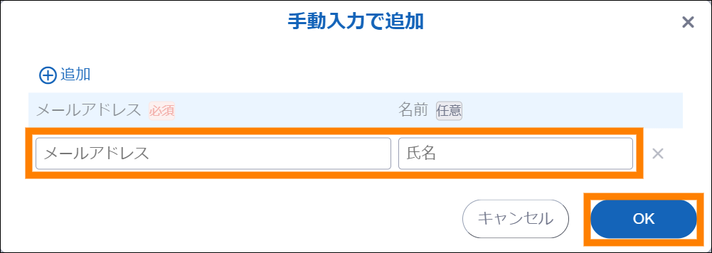 - [手動入力で追加]から参加者を追加する場合、次の画面が表示されます。メールアドレス、および名前を入力し[OK]をクリックします。