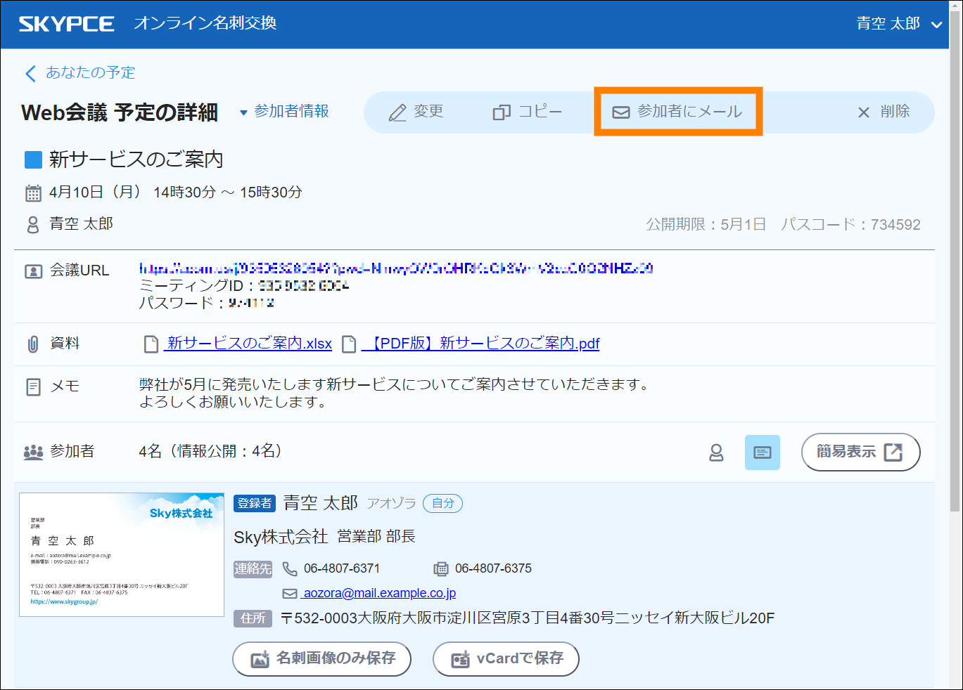 オンライン名刺交換の依頼および、Web会議の案内メールの送信後に、作成したWeb会議を操作する方法を説明します。操作は「Web会議 予定の詳細」画面から行います。「Web会議 予定の詳細」画面では、予定の確認、コピー、編集、削除、および参加者へメールの再送信ができます。また、「Web会議 予定の詳細」画面では参加者が登録したオンライン名刺の確認もできます。