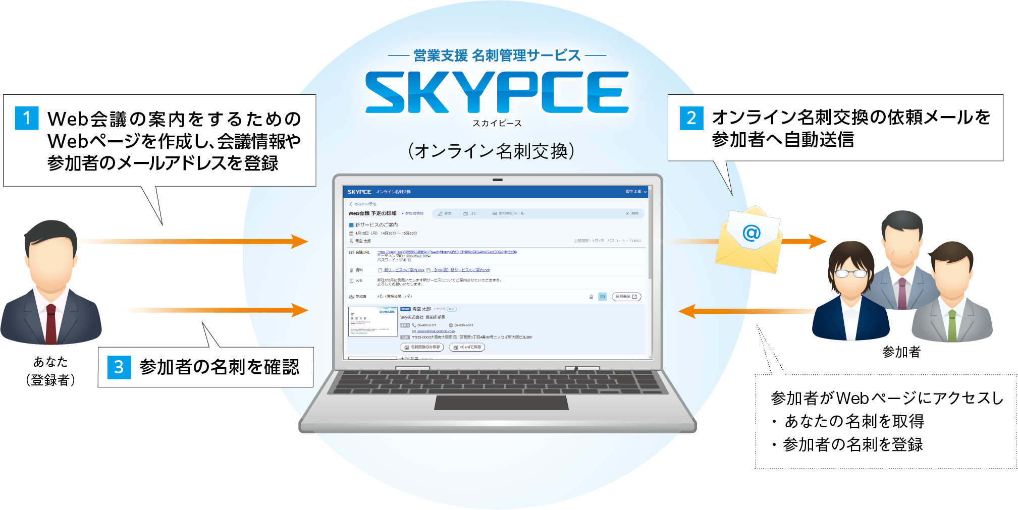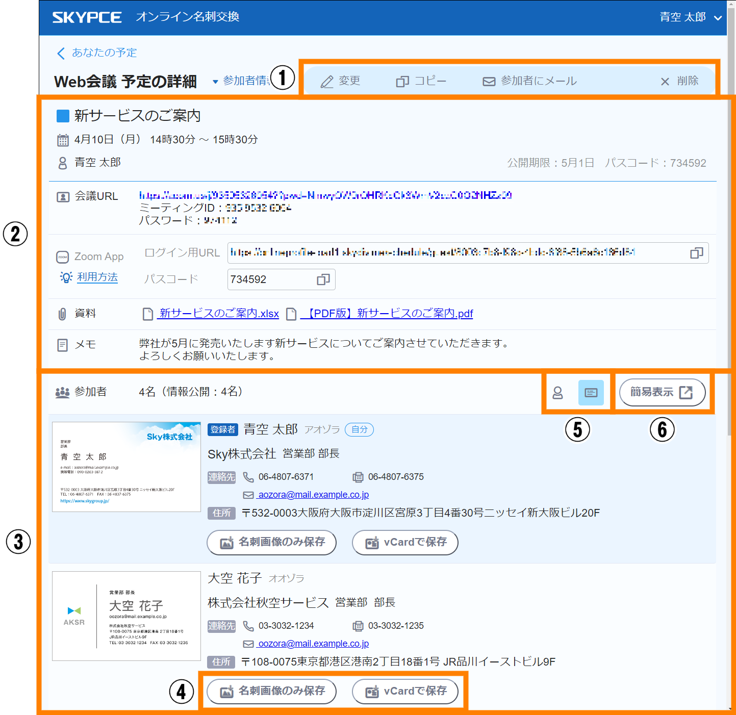 | ③ | 参加者 | 参加者が一覧で表示されます。参加者によって登録された名刺は、名刺をスキャンした際と同様にデータ化され、自動で「SKYPCE(名刺管理)」にも登録されます。 | |