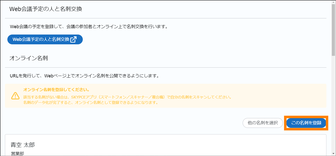 - オンライン名刺を初めて登録する場合は、次の画面が表示されます。名刺を確認し、[この名刺を登録]をクリックしてください。